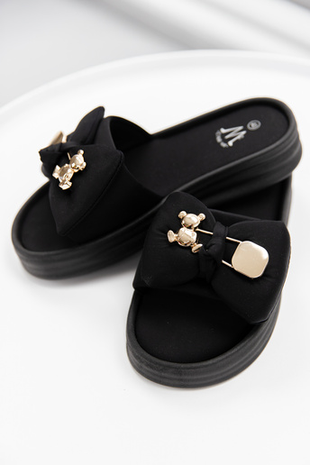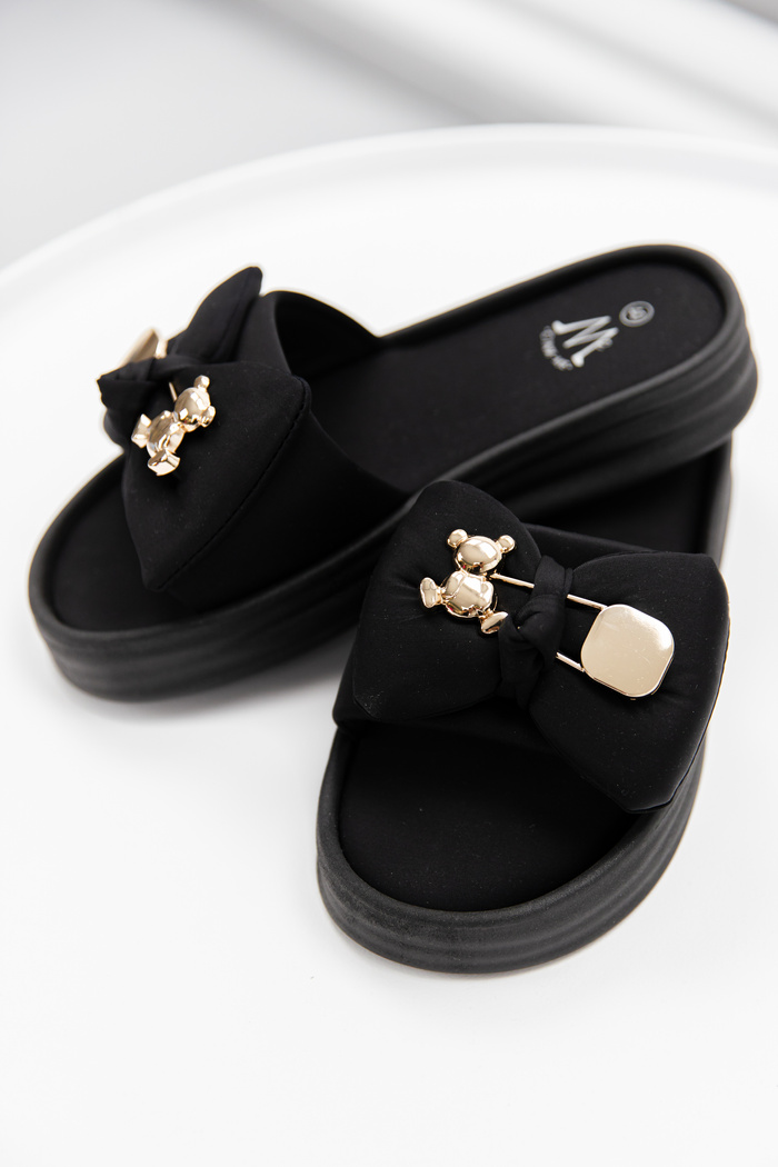 Czarne klapki na platformie z kokardką i złotą aplikacją