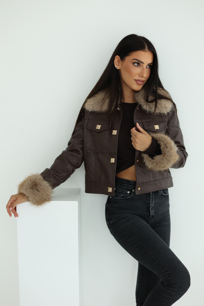 Krótka kurtka z futerkiem Tessa imitacja skóry brązowa