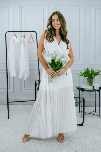 Śmietankowa plisowana sukienka Lorenza z wiązanym paskiem