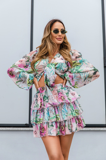 Komplet La Diva spódnico-spodenki bluzka różowy kwiatowy wzór