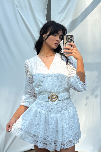 Dopasowana sukienka z marszczeniami i różą krótkie rekawy Sue beżowa