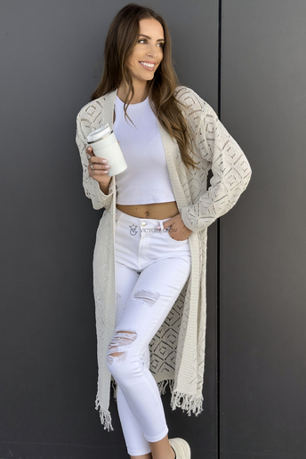 Kremowy ażurowy kardigan Lila bez zapięcia z frędzlami