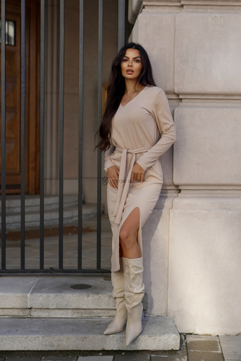 W talii wiązany pasek doskonale podkreśla sylwetkę.