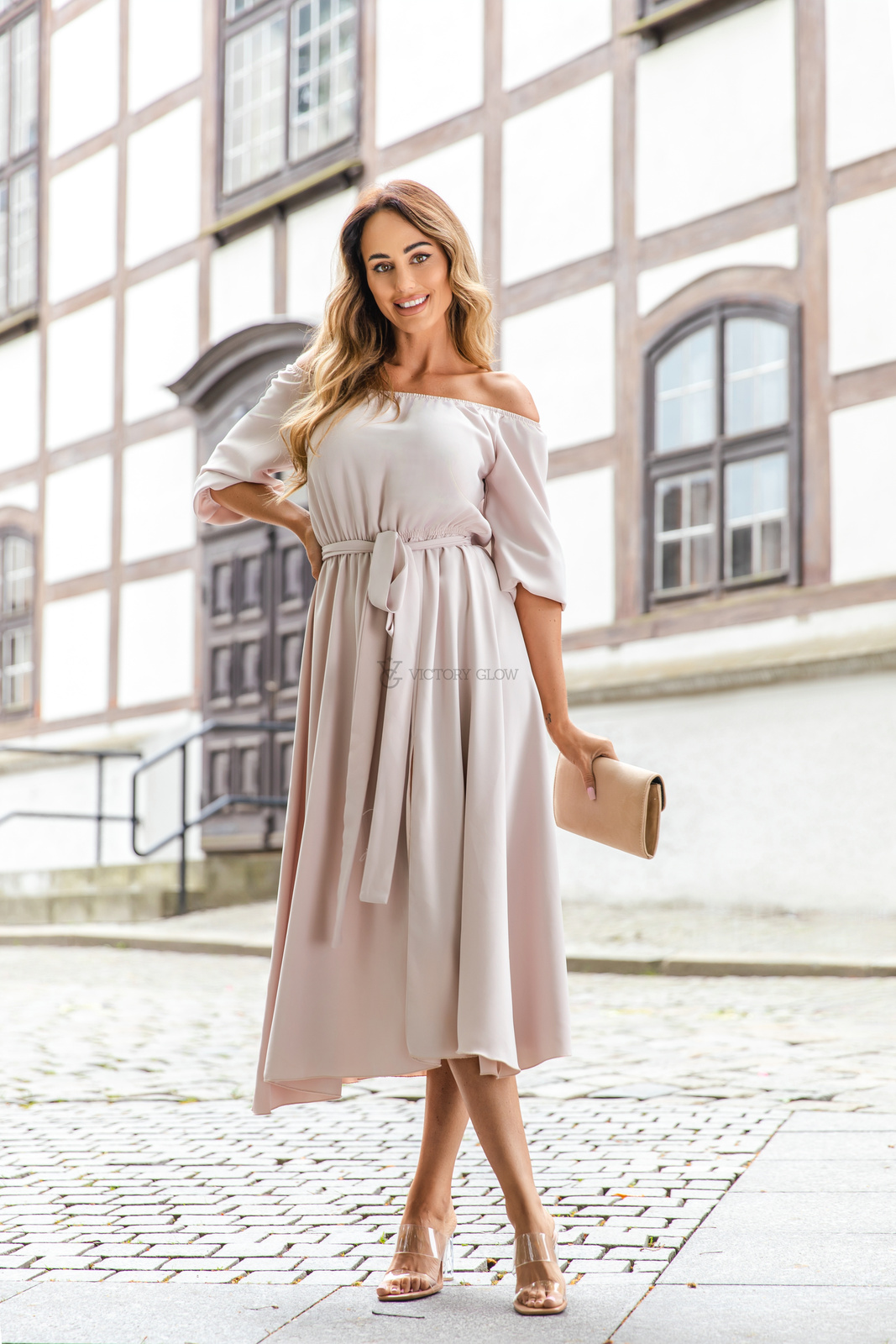 - Beżowa sukienka midi z dekolt emcarmen i wiązanym paskiem