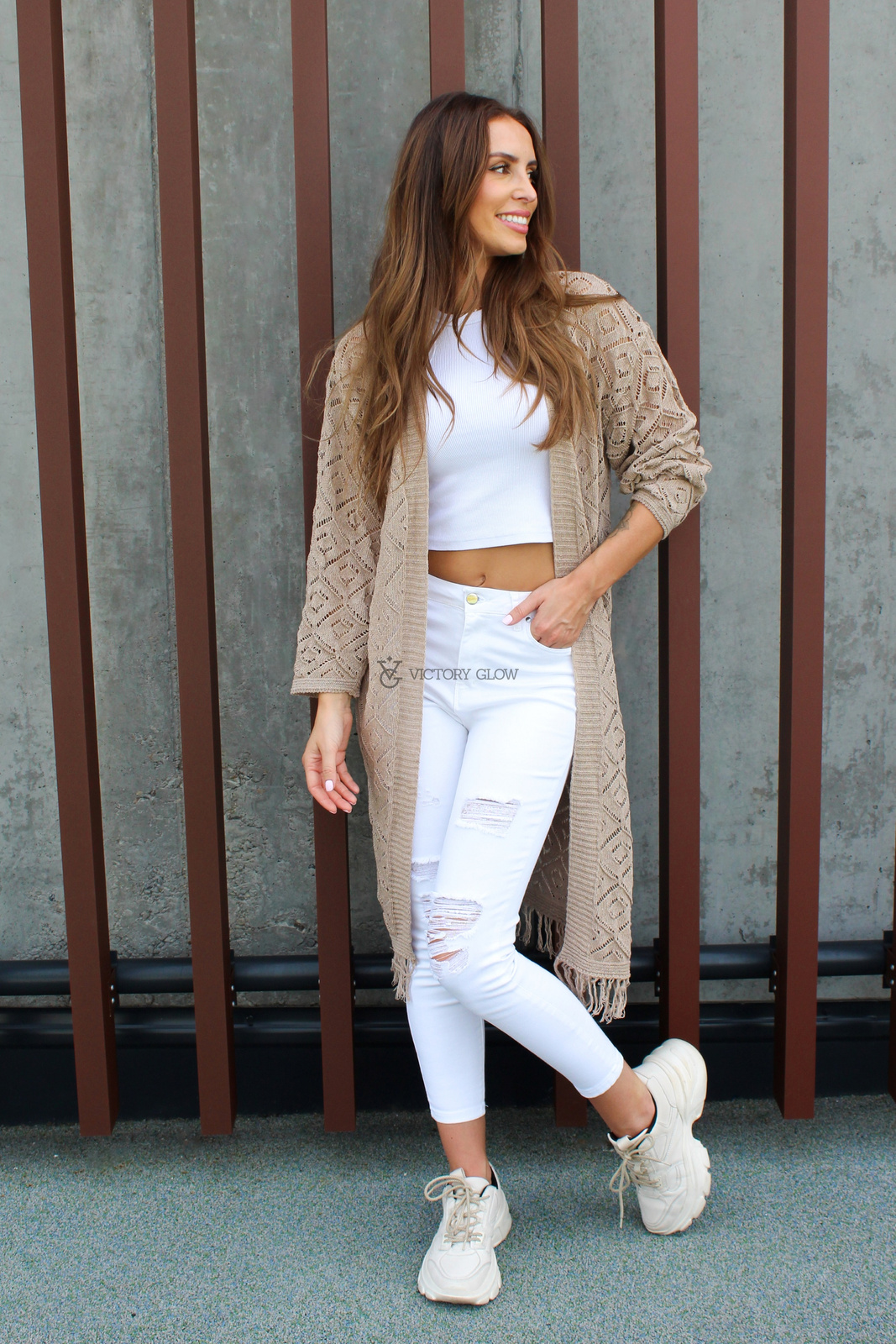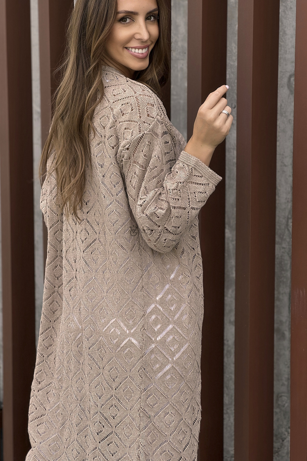 Ażurowy, dłuższy kardigan to doskonały wybór do uzupełnienia wielu wakacyjnych stylizacji w stylu boho.