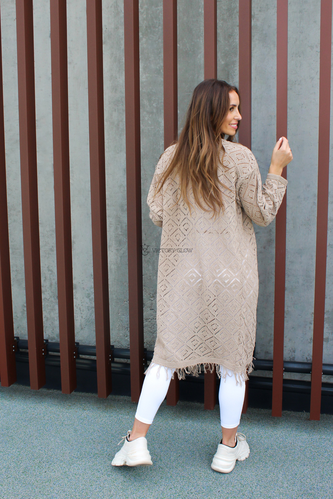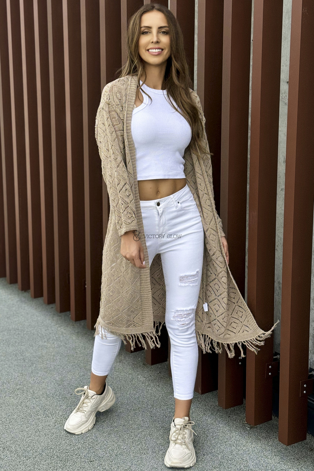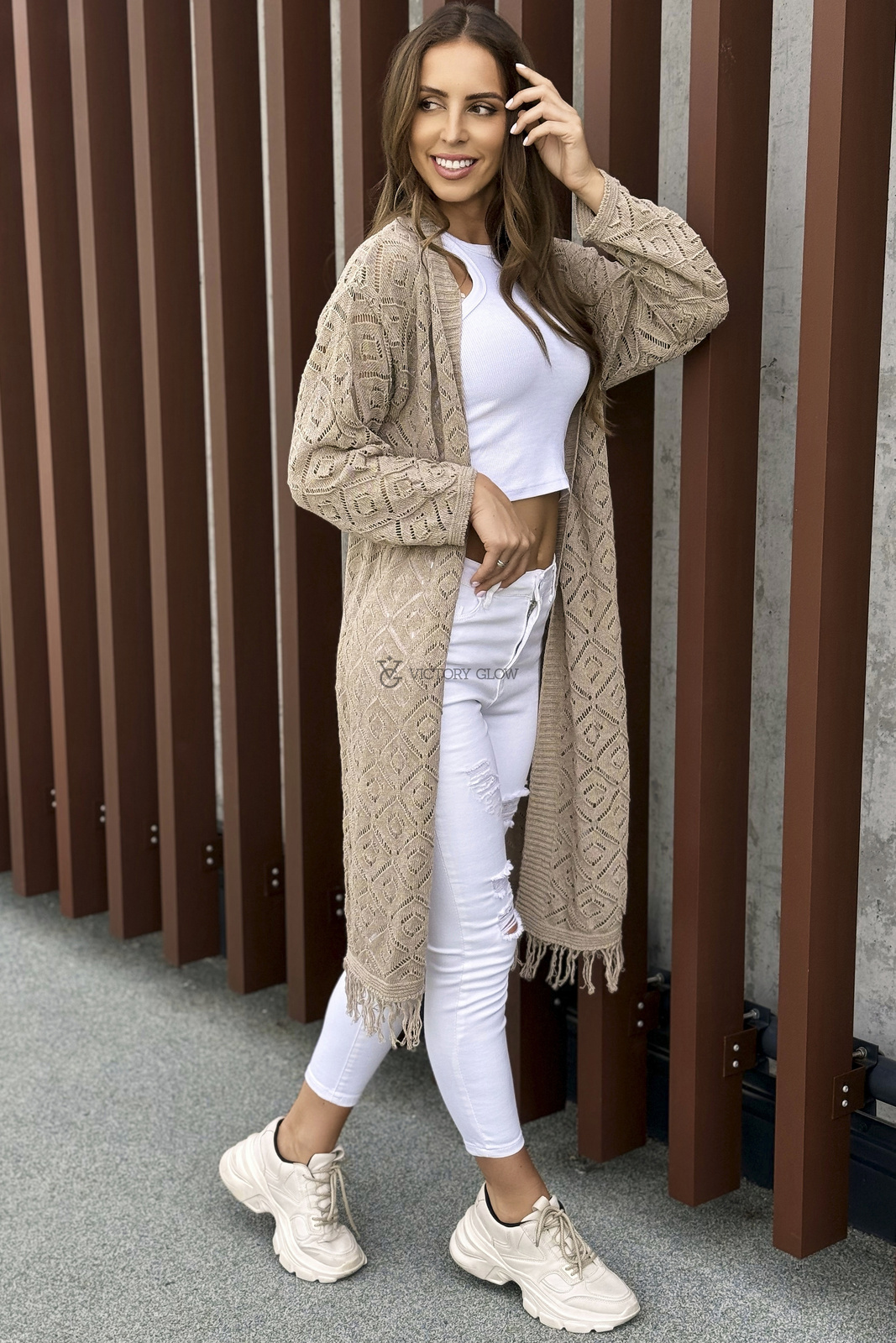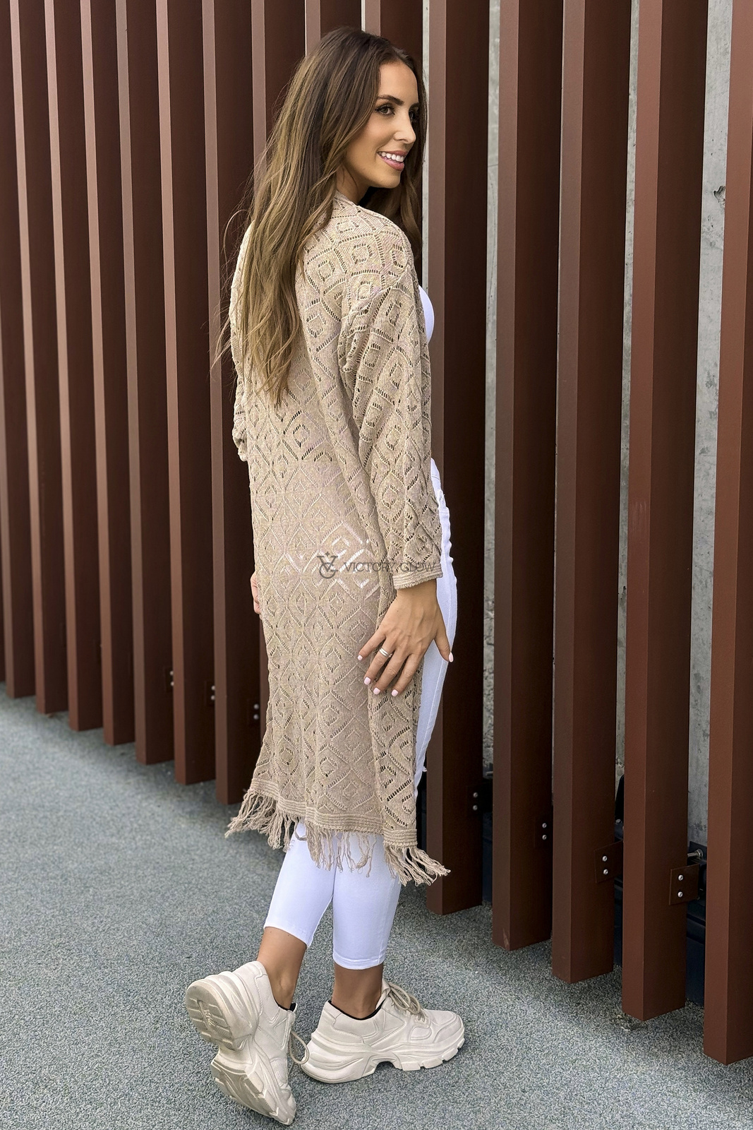 - Beżowy ażurowy kardigan Ludmiła bez zapięcia z frędzlami