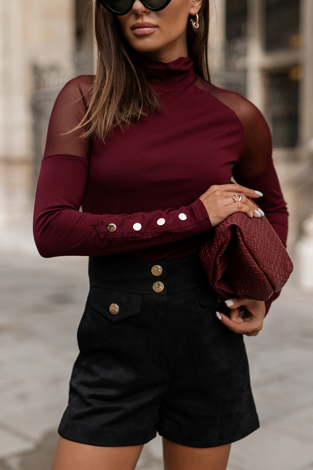 Design bluzki wyróżnia się złotymi napami, które dodają jej elegancji i nowoczesnego charakteru. Te subtelne detale świetnie komponują się z bordowym kolorem, tworząc harmonijną całość. Bluzka doskonale pasuje zarówno do spodni, jak i spódnic, co pozwala na tworzenie różnorodnych stylizacji, które podkreślą twój indywidualny styl.