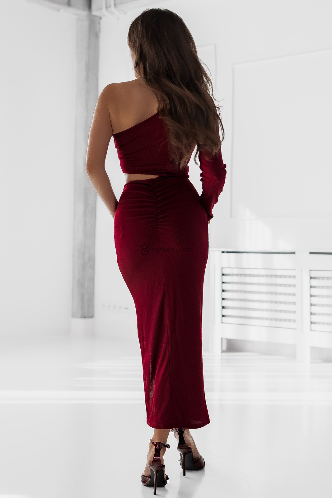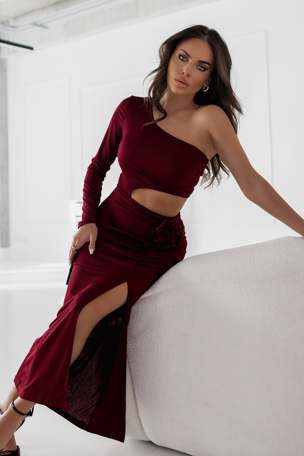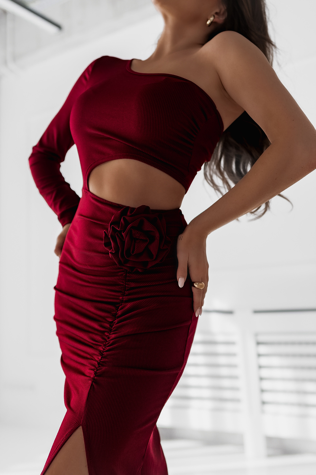 Długa sukienka na jedno ramię Doris w prążek bordowa