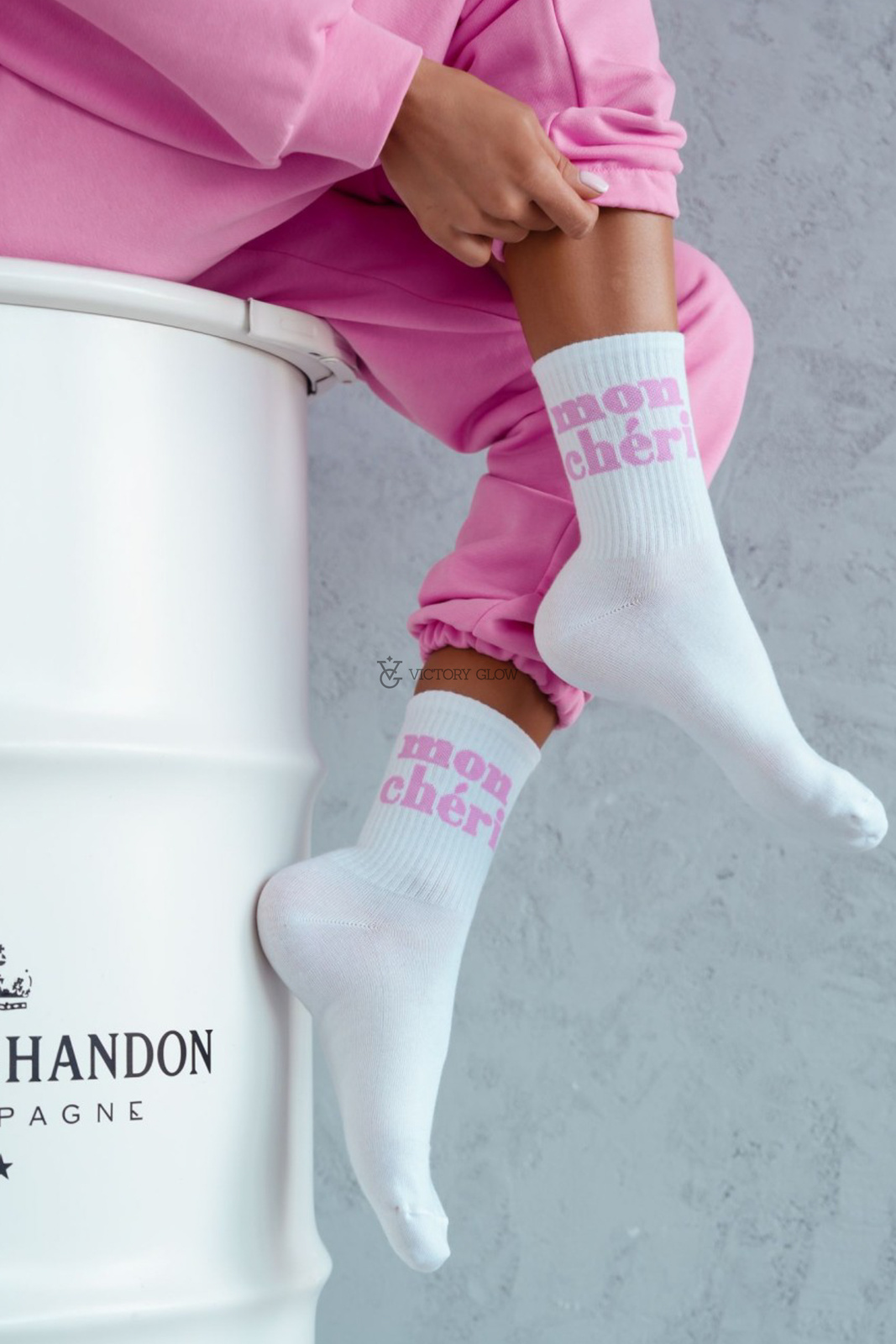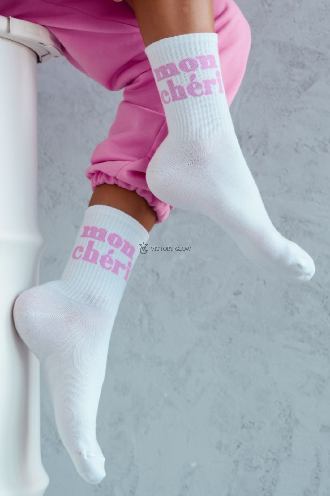 Długie skarpetki z nadrukiem Mon Cheri białe