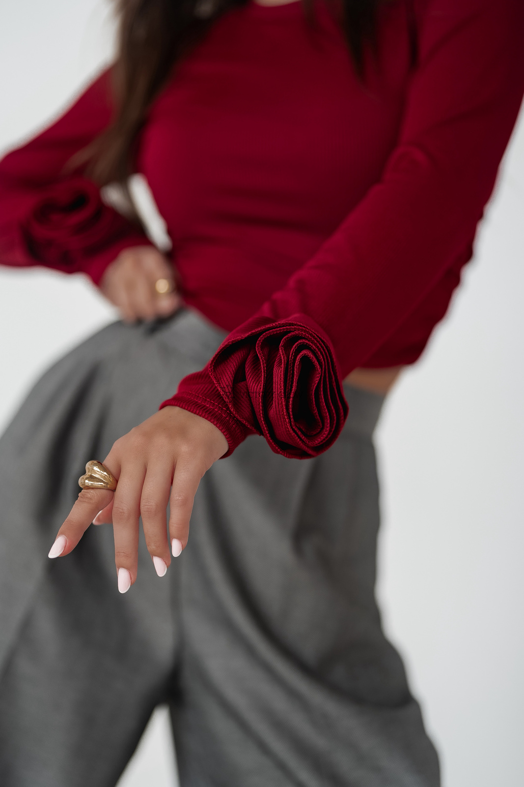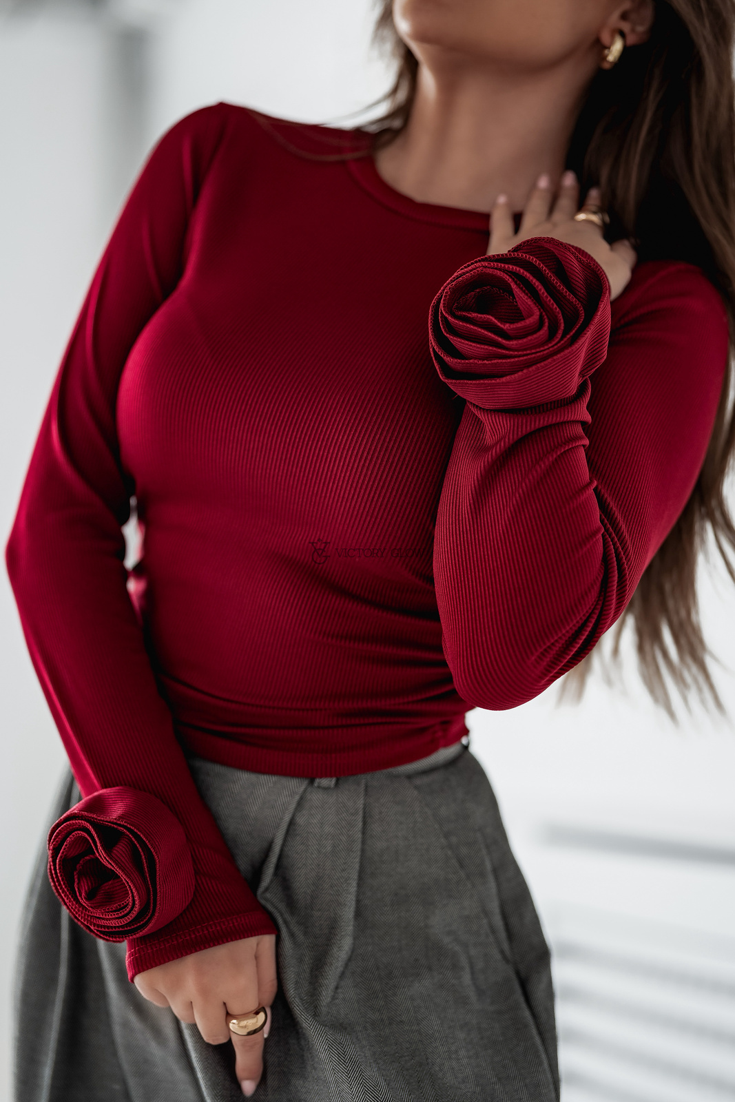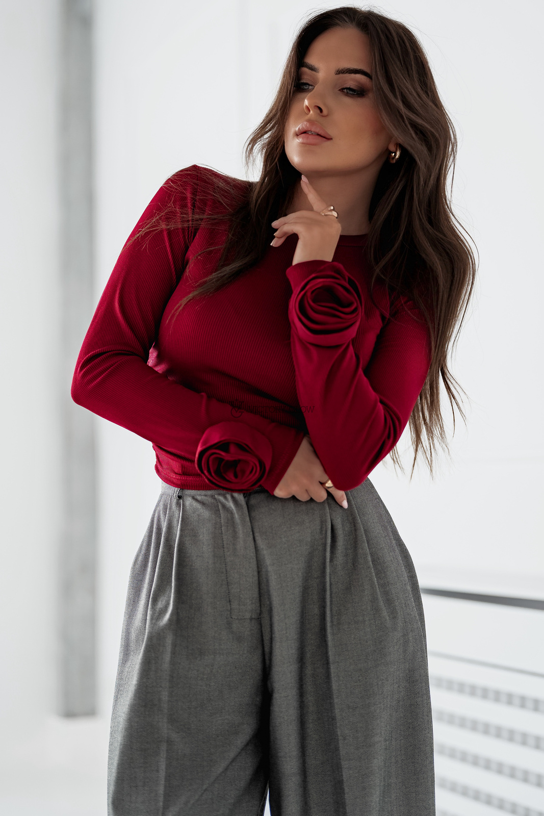 Dopasowana bluzka w prążek z różą Iga bordowa
