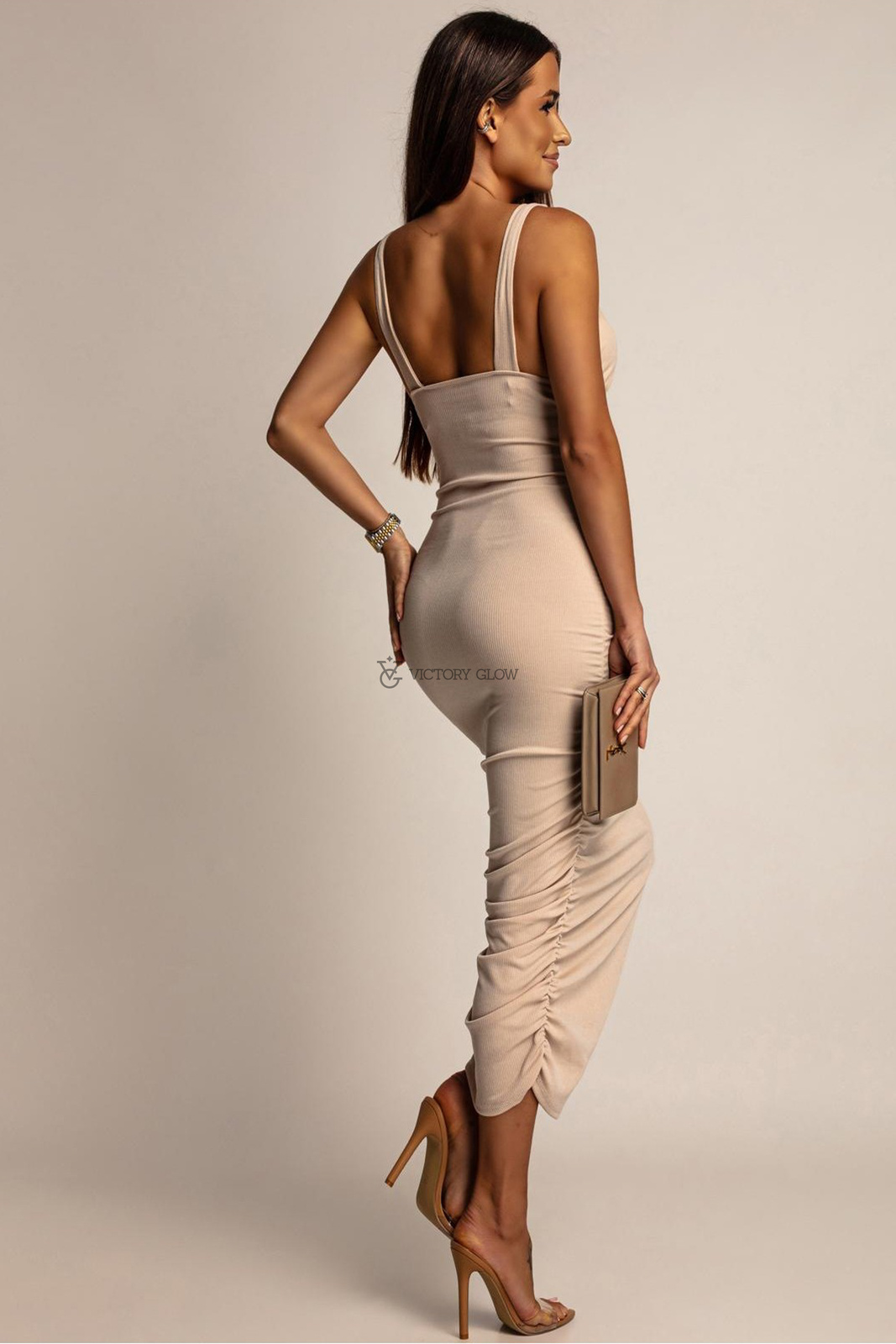 Drapowania po bokach dodają kobiecego uroku, czyniąc tę sukienkę idealną propozycją na wyjątkowe okazje - od romantycznej kolacji po wesele czy wieczorne wyjście.