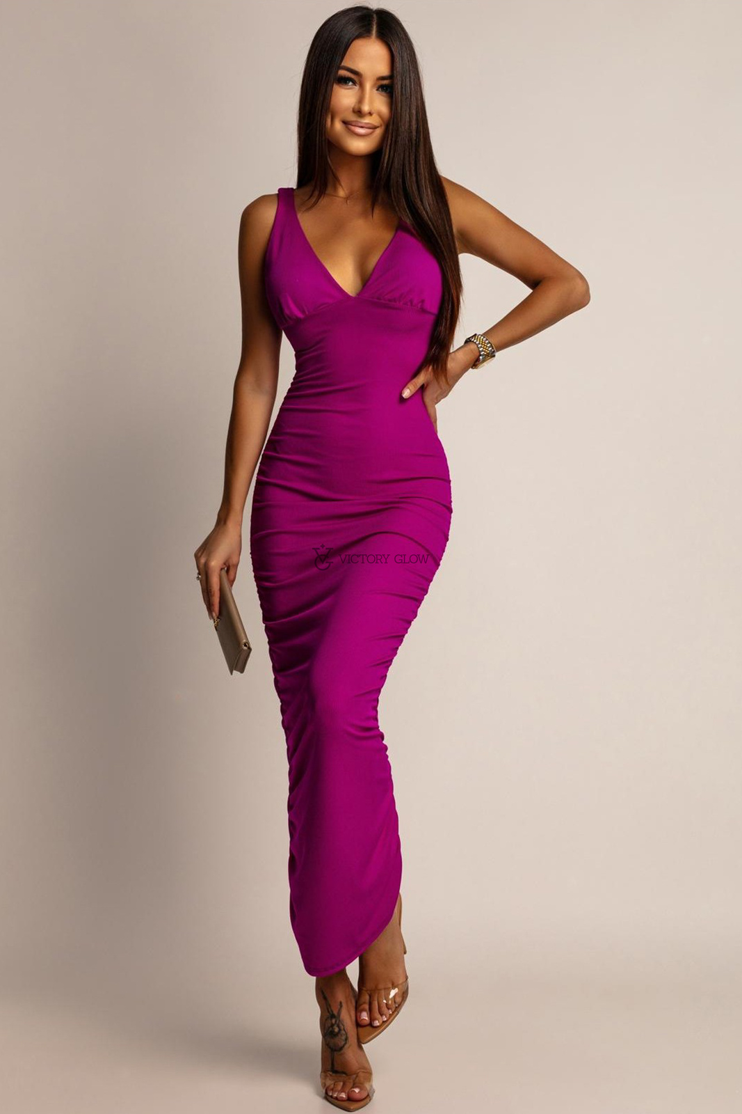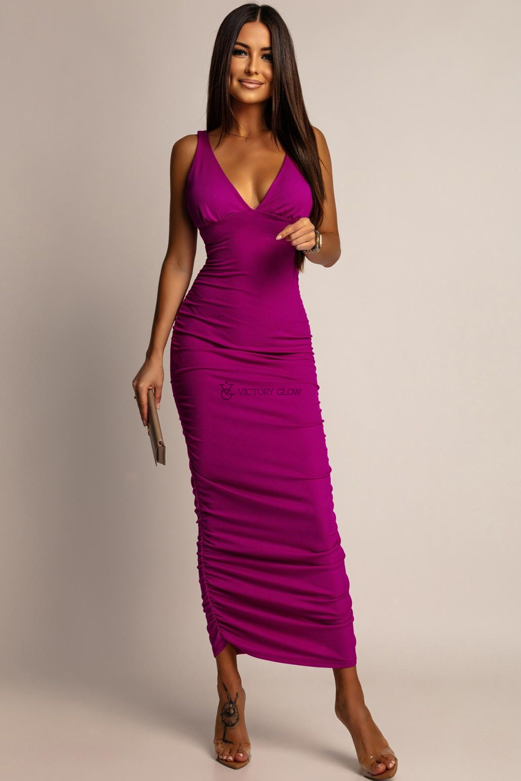 Drapowania po bokach dodają kobiecego uroku, czyniąc tę sukienkę idealną propozycją na wyjątkowe okazje - od romantycznej kolacji po wesele czy wieczorne wyjście.