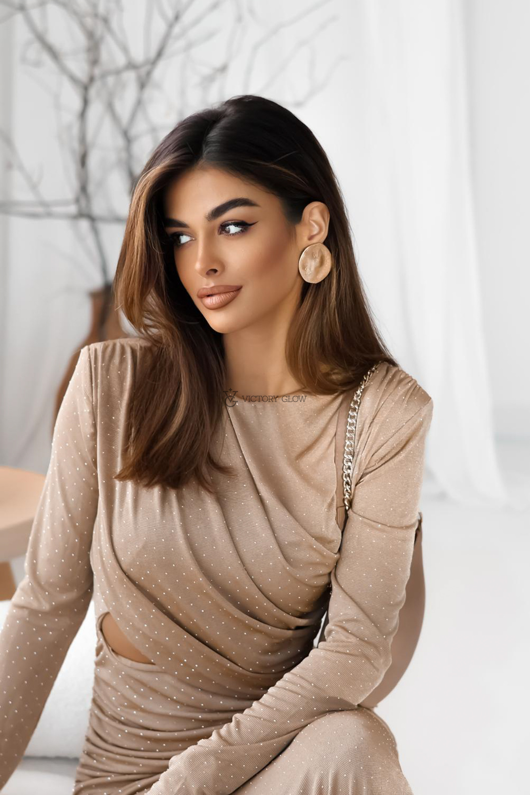 Dopasowana sukienka wieczorowa z wycięciem Siena beżowa