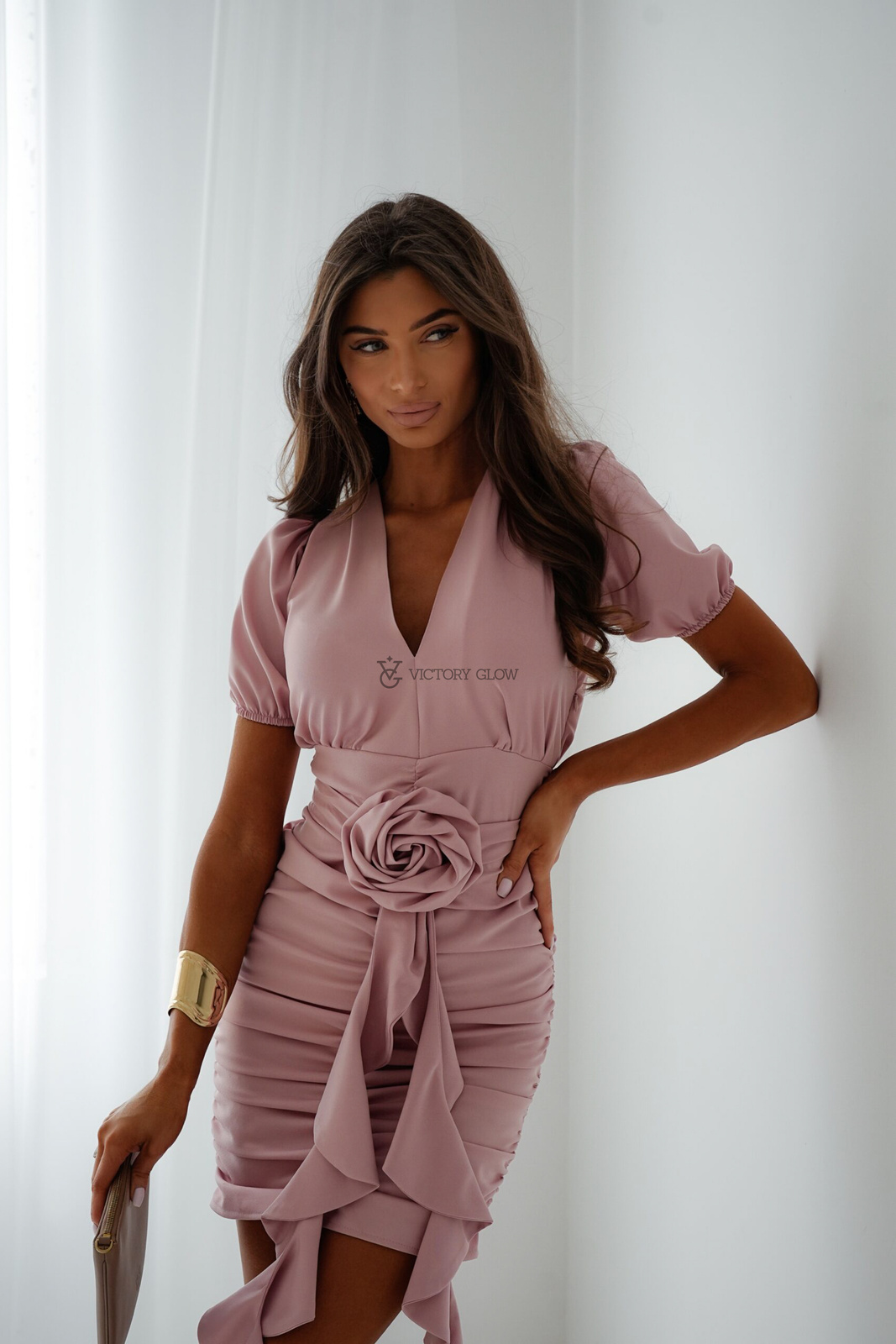 Dopasowana sukienka z marszczeniami i różą krótkie rękawy Sue pudrowy róż