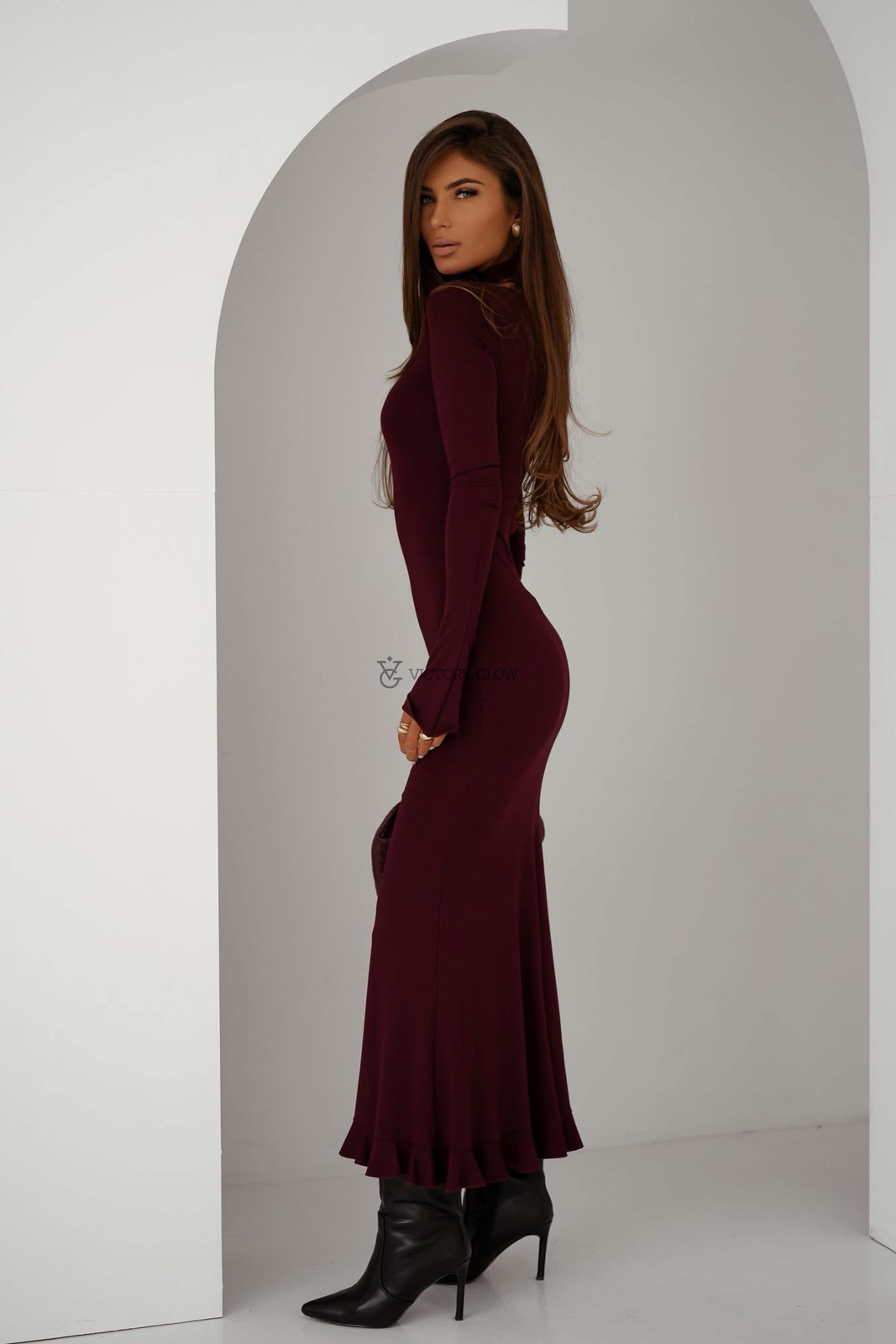 Wykonana z lekko elastycznego materiału, doskonale dopasowuje się do sylwetki, podkreślając kobiece kształty. Dół sukienki delikatnie  rozszerzany, wykończony małą falbaną, tworzy efektowne, płynne linie przy każdym ruchu.