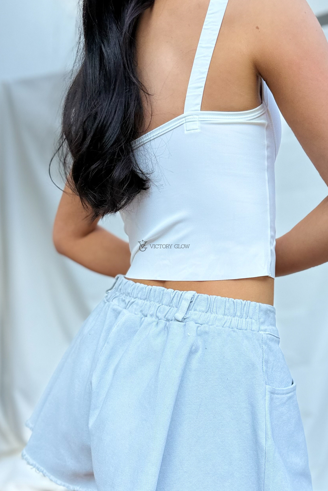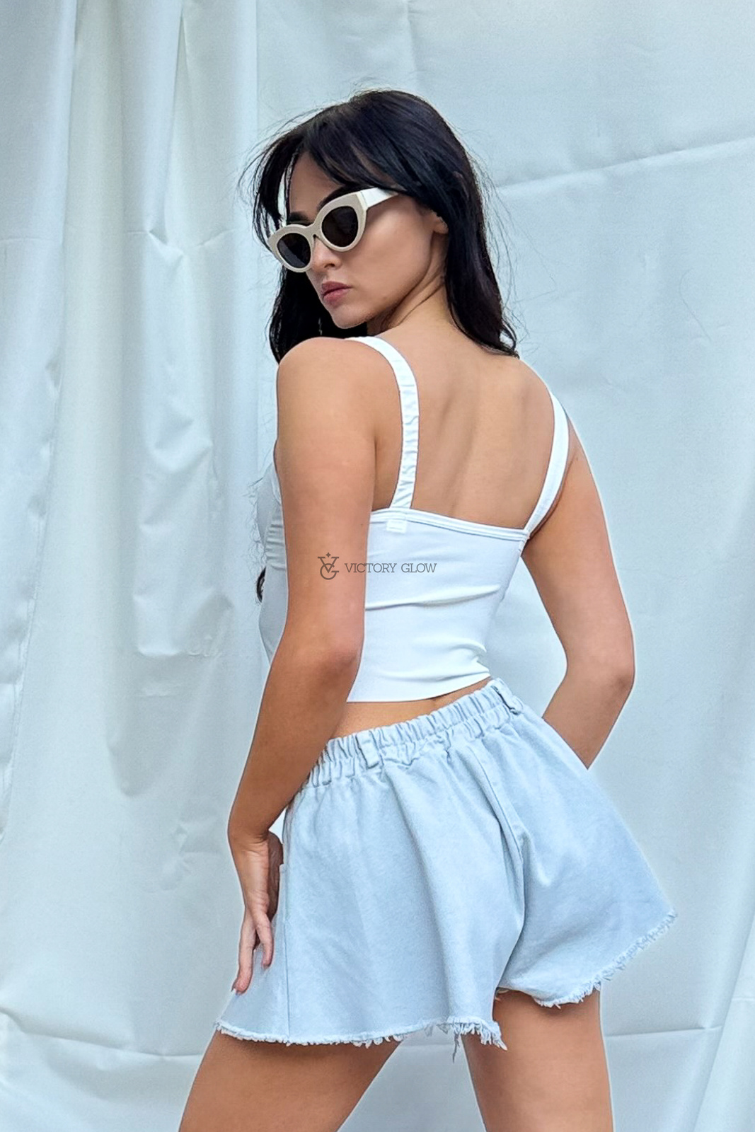 Krótki, dopasowany top na szerszych ramiączkami to świetna baza wielu stylizacji.