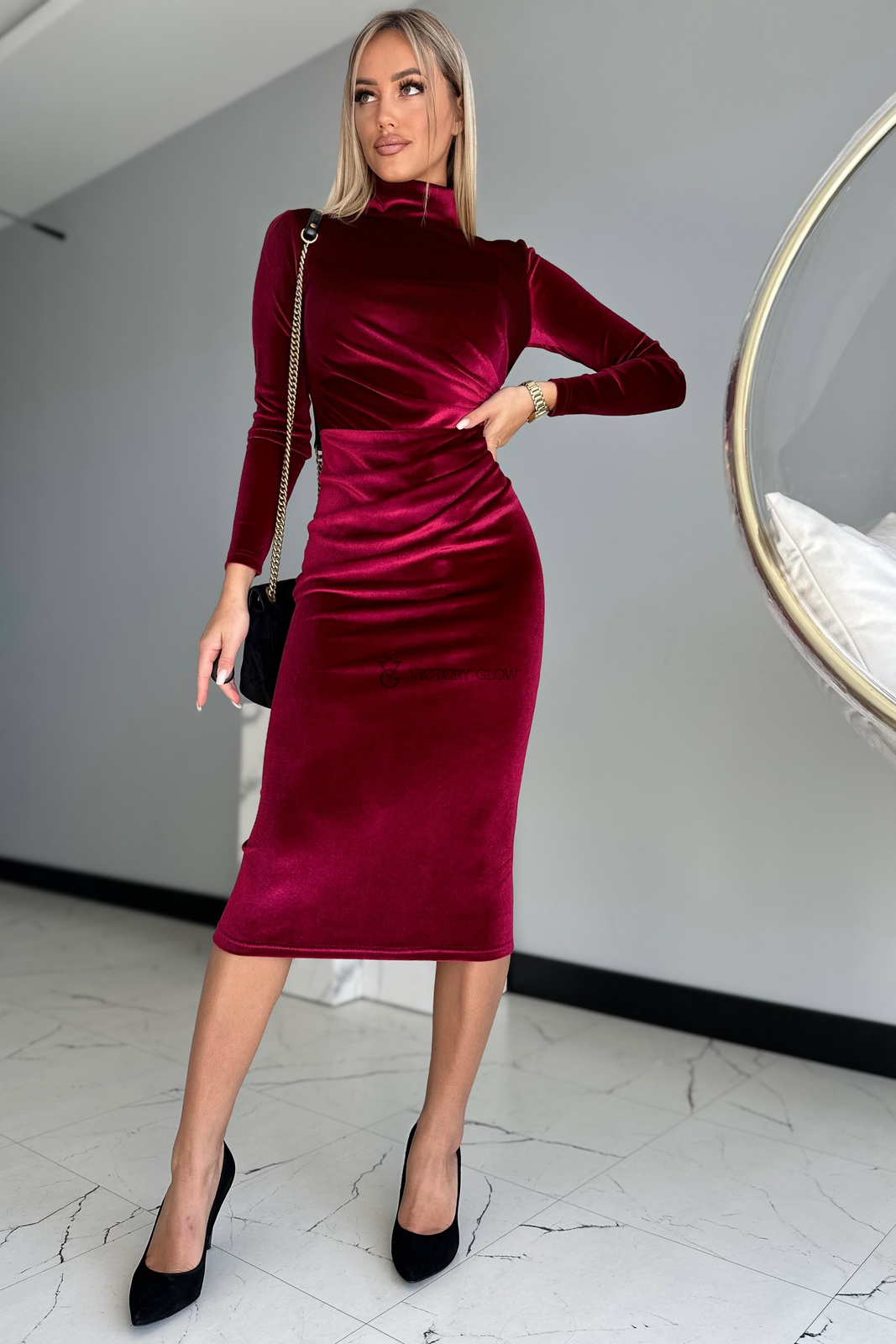 Zjawiskowa sukienka welurowa midi o dopasowanym kroju, która pięknie podkreśla kobiecą sylwetkę. Wykonana z wysokiej jakości, miękkiego weluru, gwarantuje komfort noszenia i elegancki wygląd. Model posiada golf oraz efektowne marszczenie na boku, które subtelnie modeluje figurę i dodaje całości wyjątkowego charakteru.