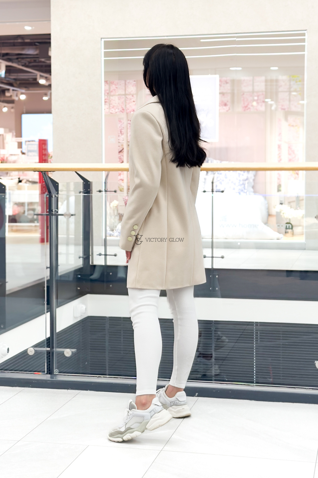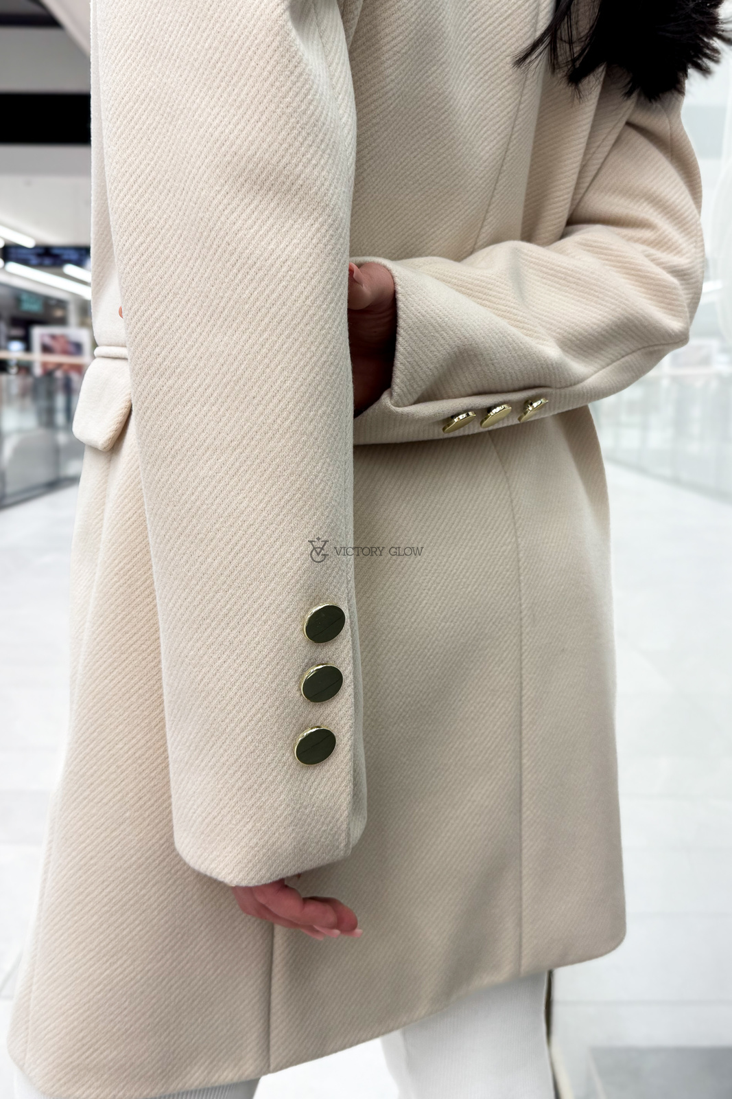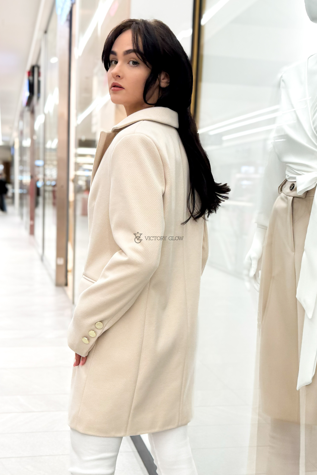 Płaszcz zapinany na dwa złote guziki umieszczone w linii poziomej.