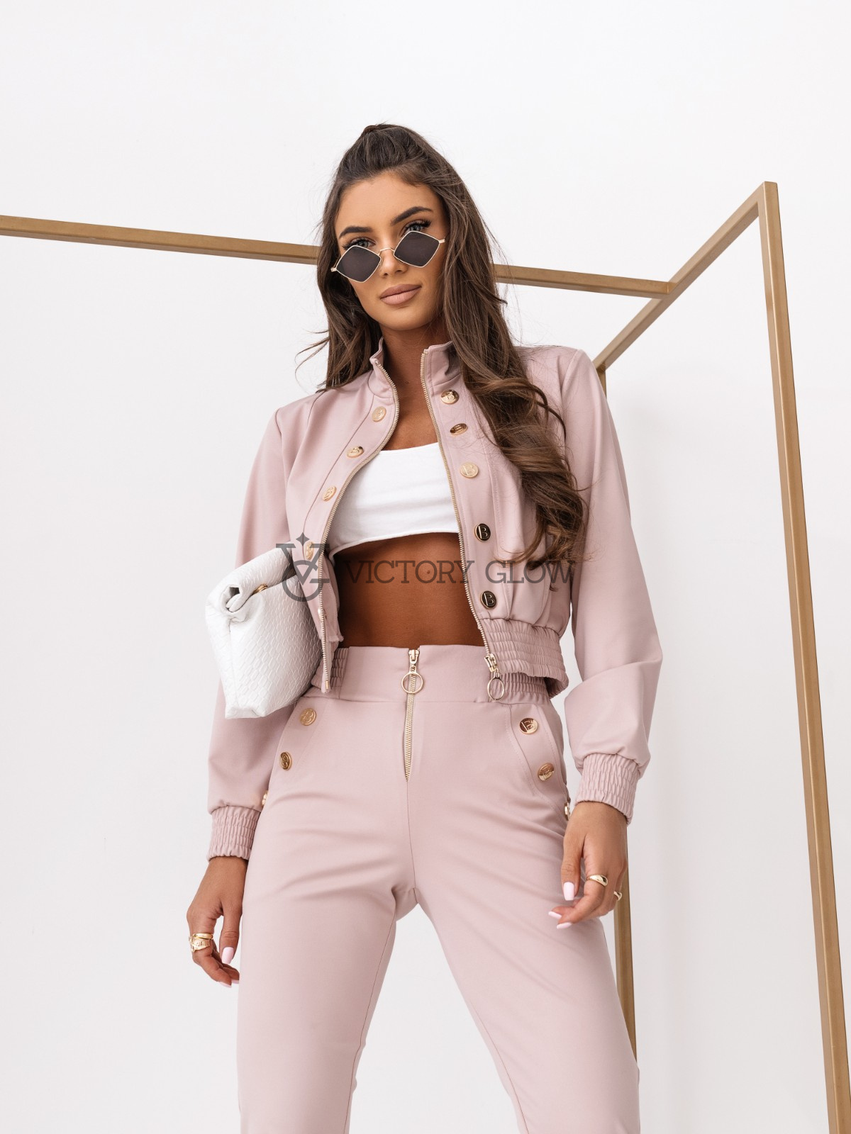 Składa się z dopasowanej góry z długim rękawem i efektownym zamkiem błyskawicznym oraz wysokich spodni z podkreśloną talią. Całość zdobią złote guziki, które nadają zestawowi wyrazistego, luksusowego charakteru.