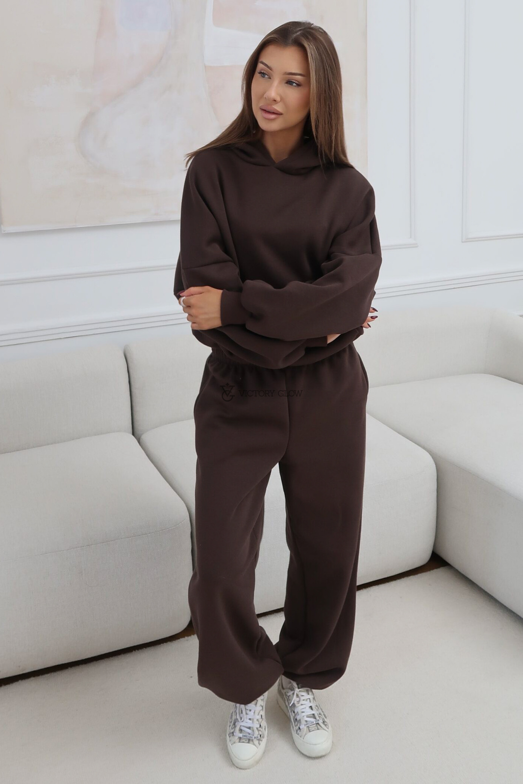 Komplet składa się z luźnej bluzy z kapturem oraz spodni o swobodnym kroju.