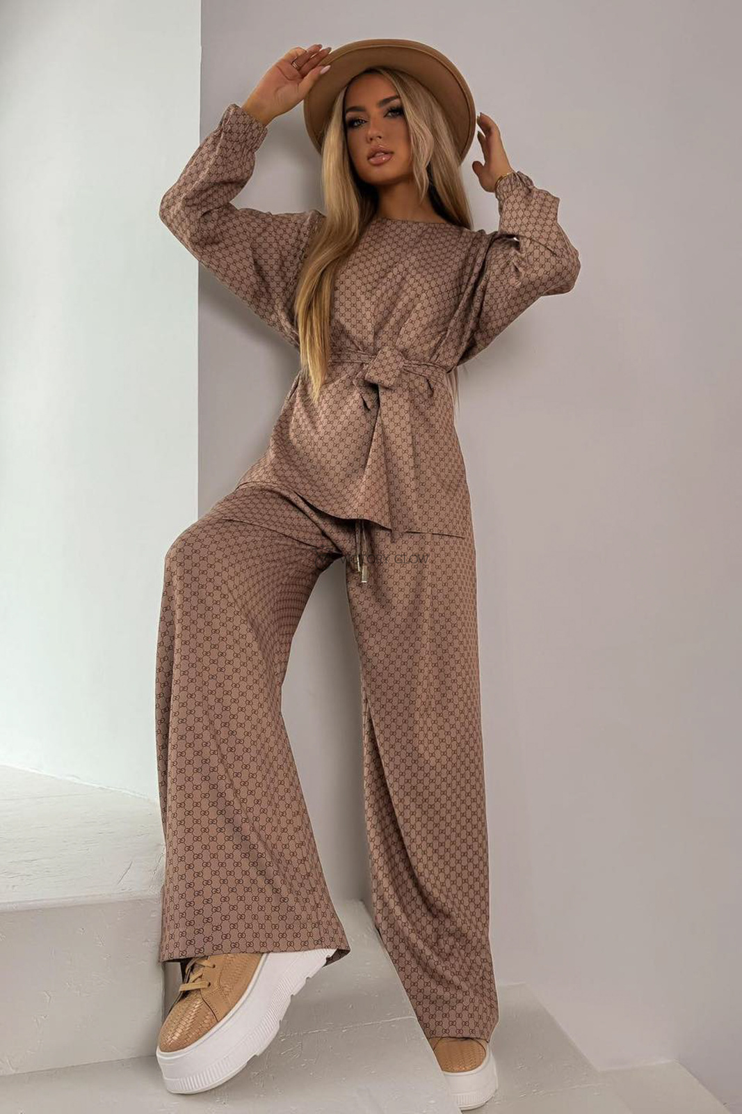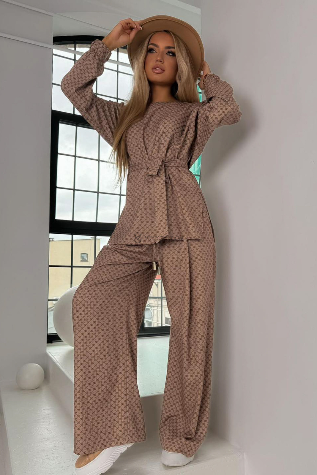 - Komplet bluzka z wiązanym paskiem i szerokie spodnie