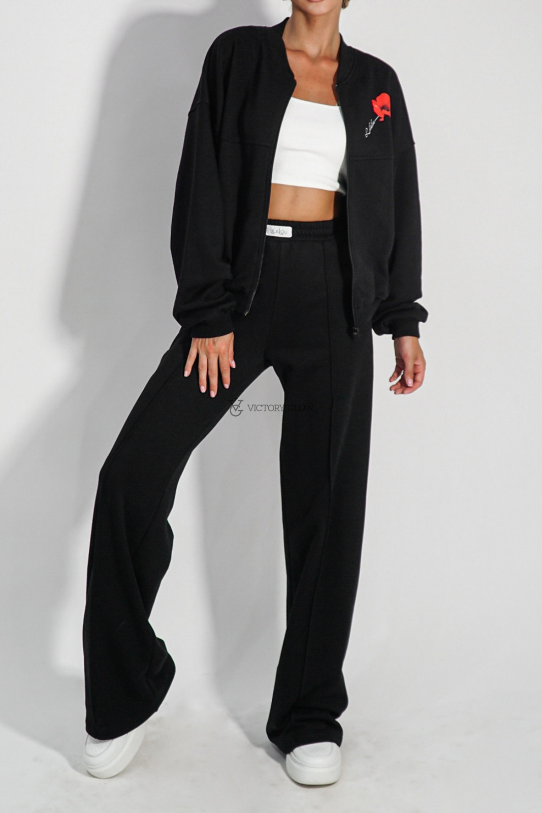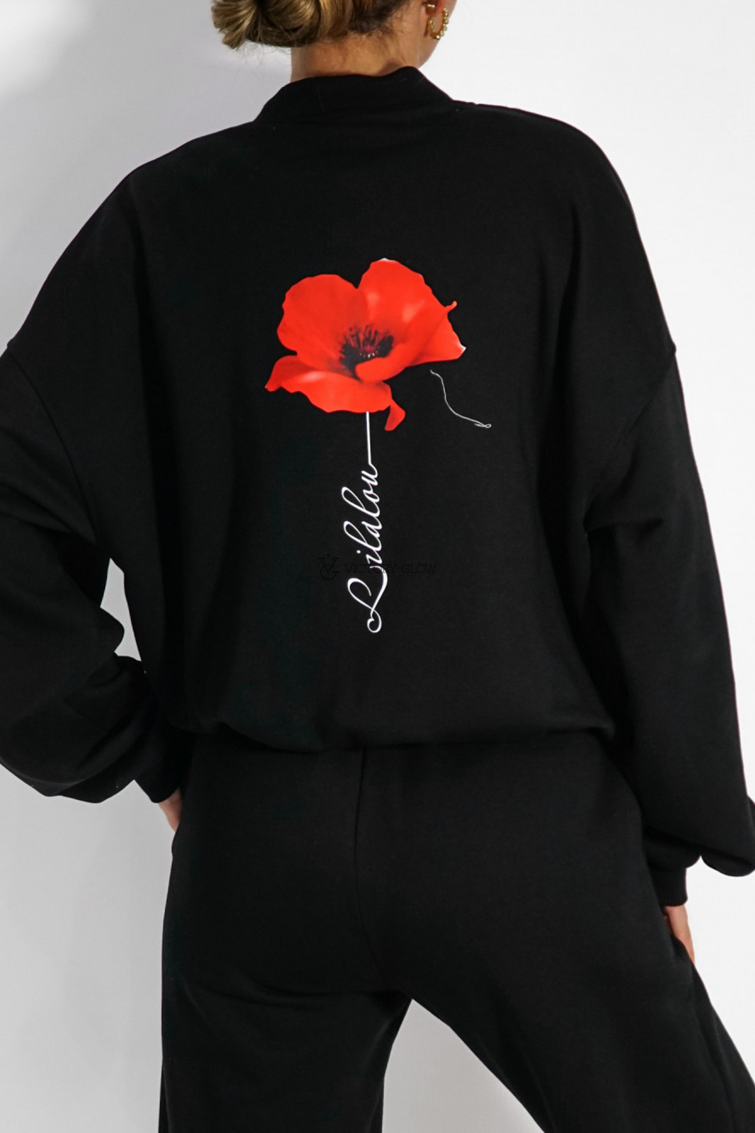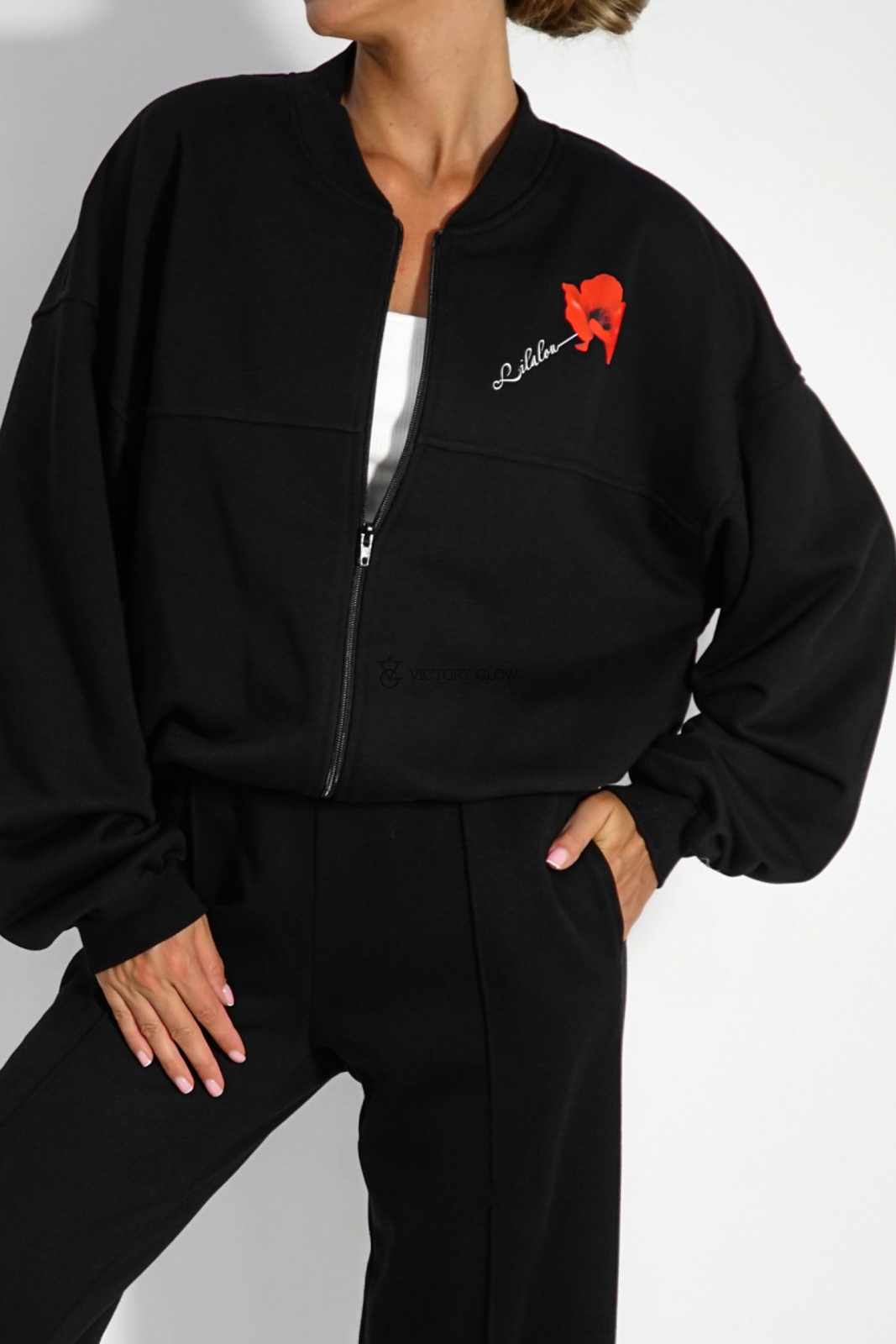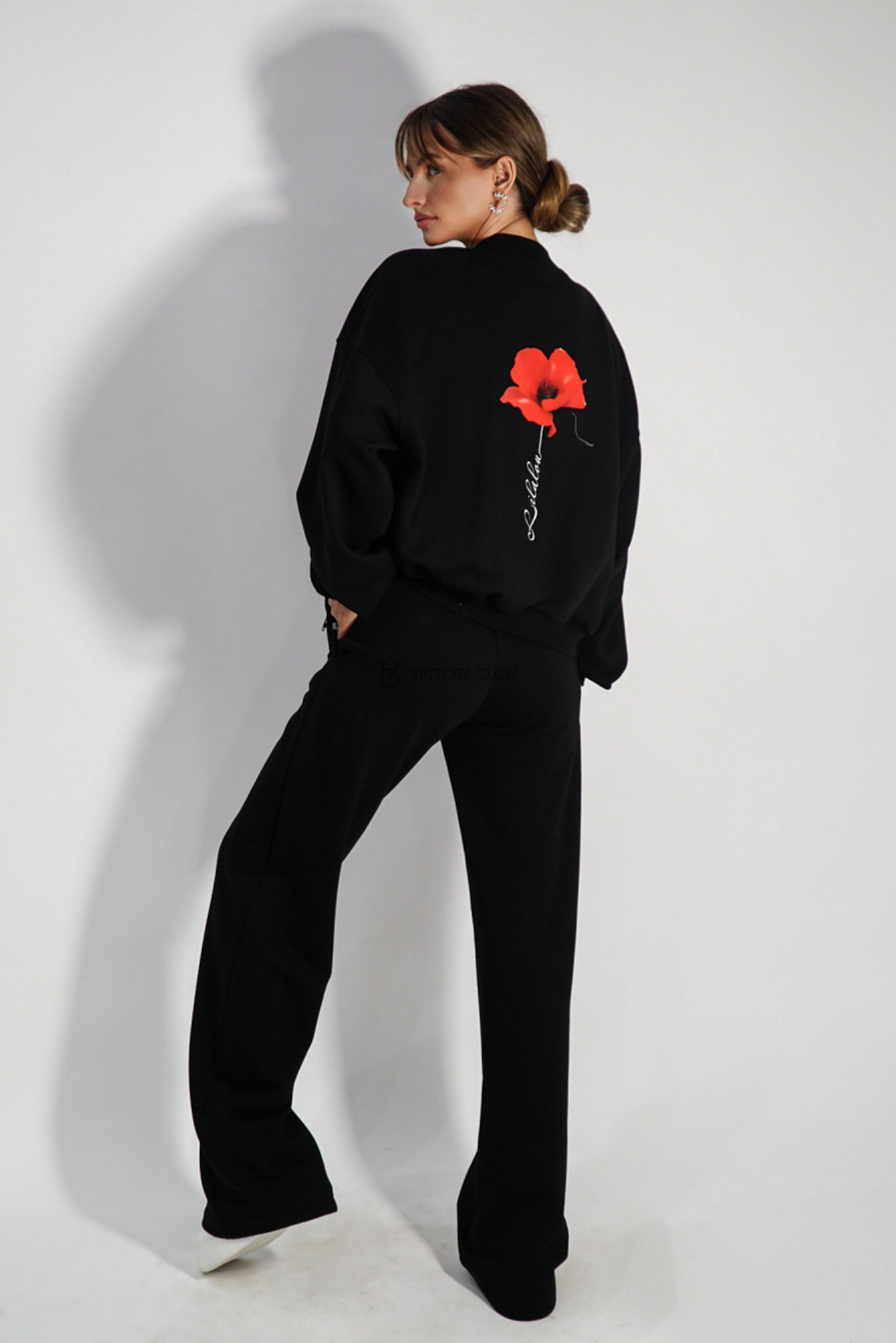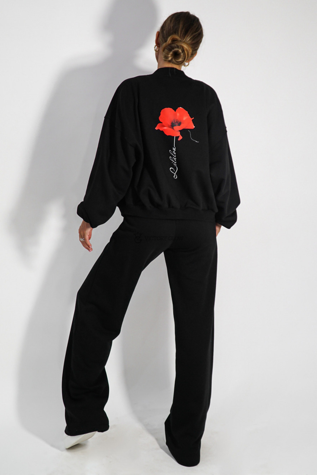 - Komplet dresowy z kwiatowym nadrukiem, bluza bomberka i spodnie z szeroką nogawką