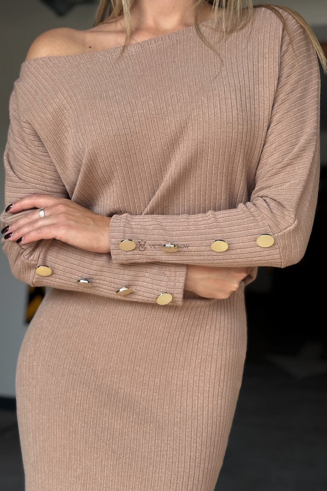 - Dzianinowy komplet: bluzka ze złotymi guzikami i dopasowana spódnica