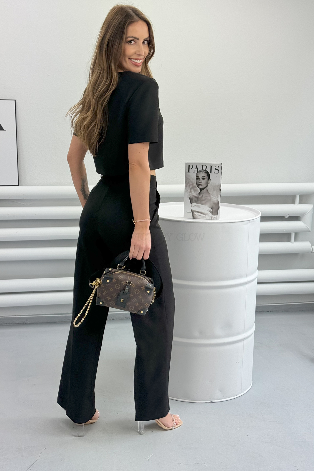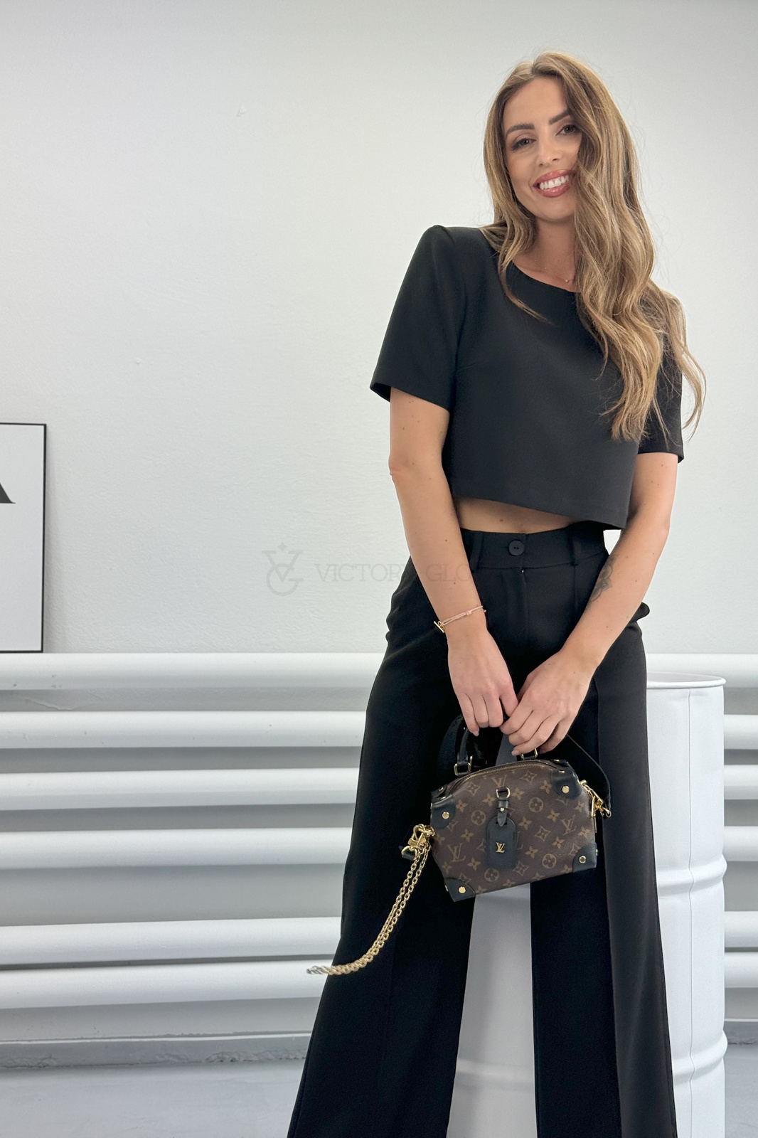 - Elegancki komplet z krótszą bluzką i szerokimi spodniami