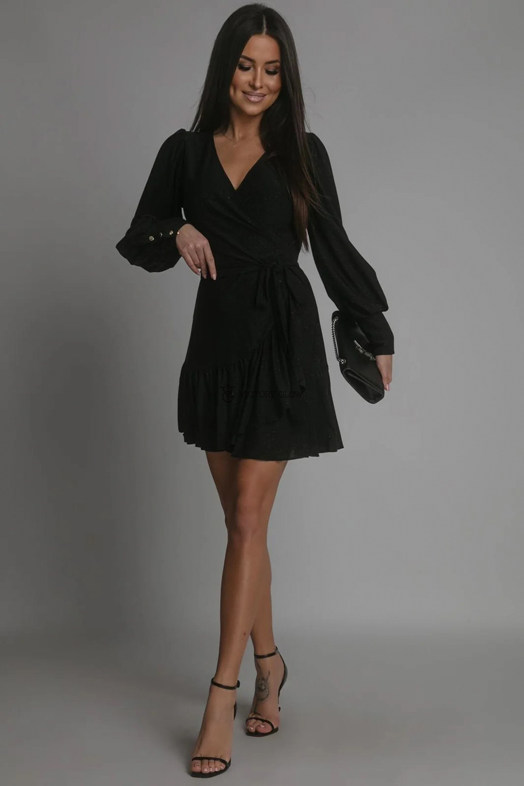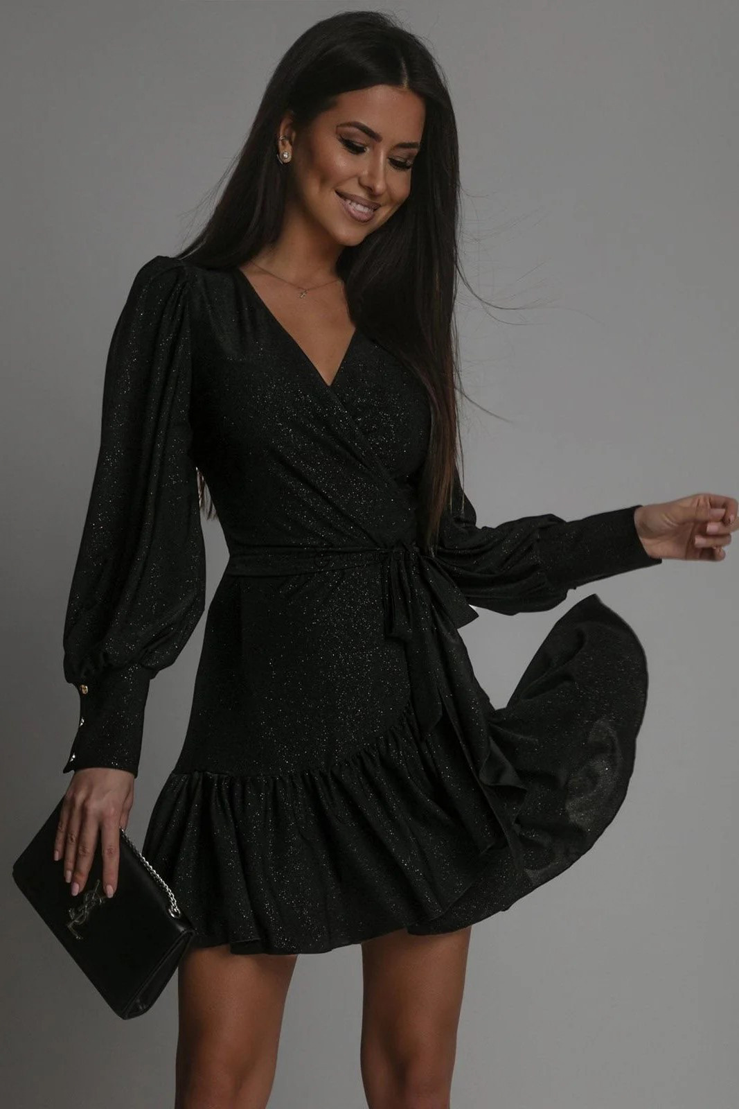• Sukienka z założeniem kopertowym, długie rękawy. Z połyskiem.