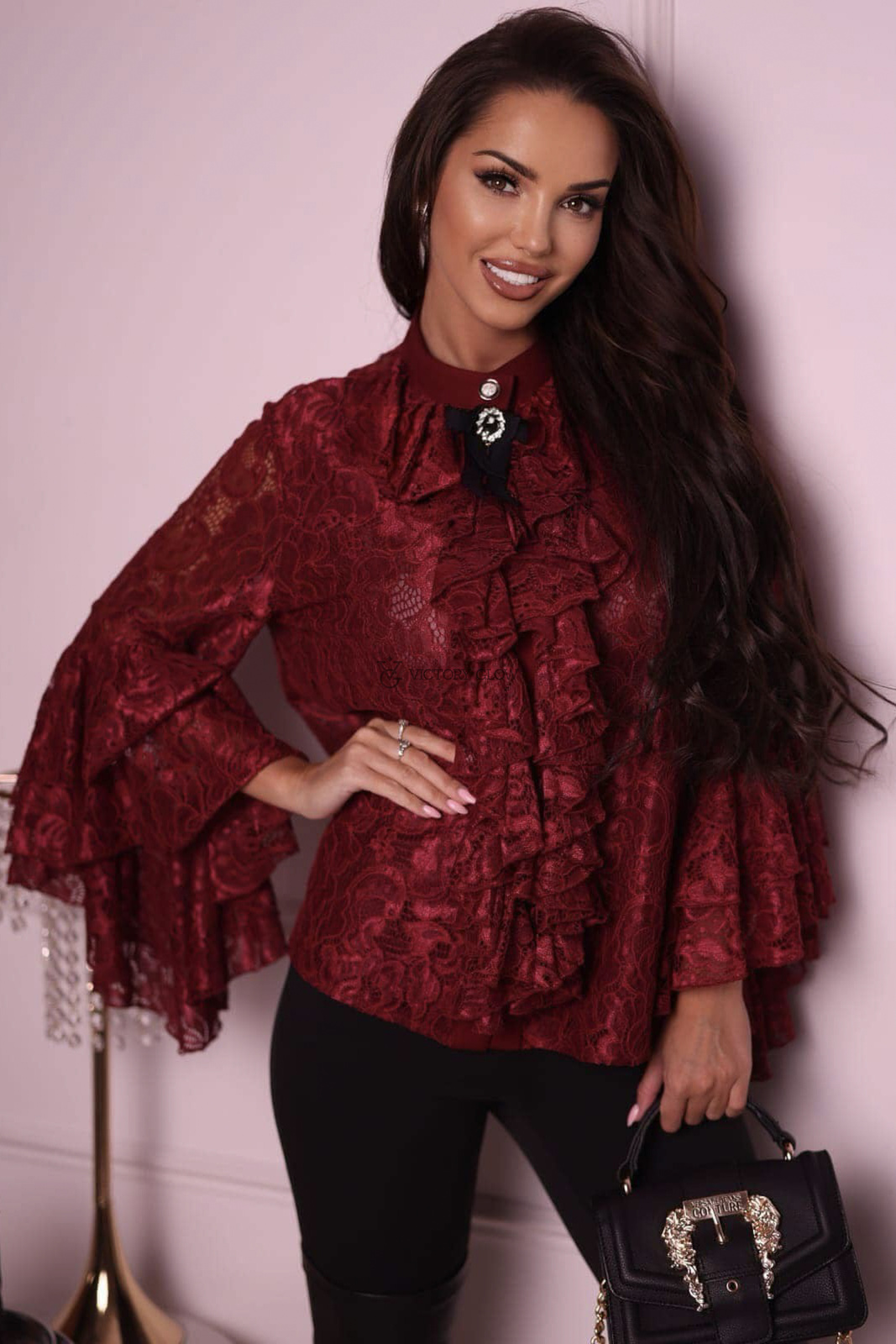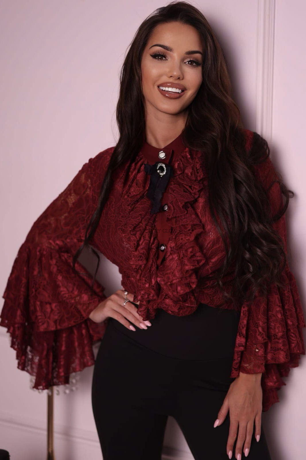Koronkowa koszula z żabotem i falbanami Becky  bordo