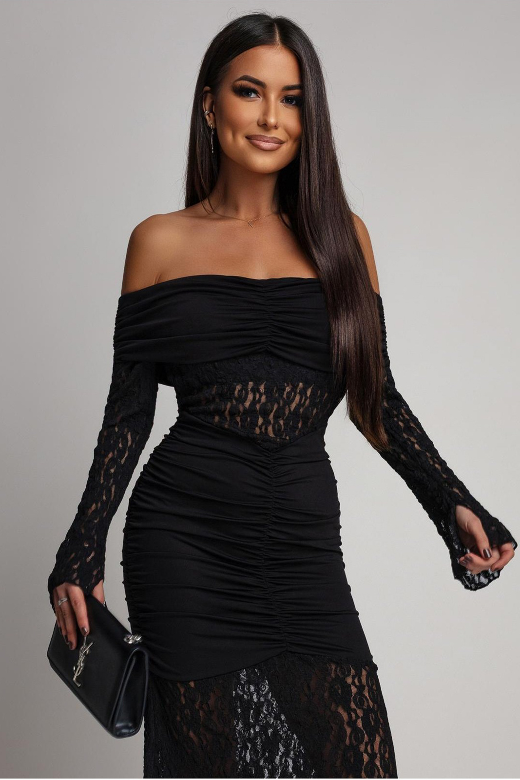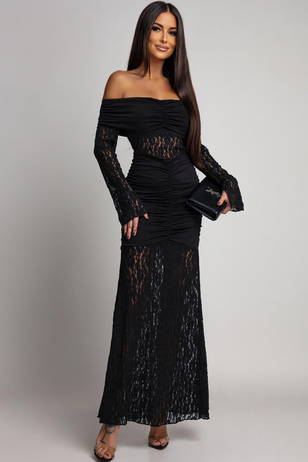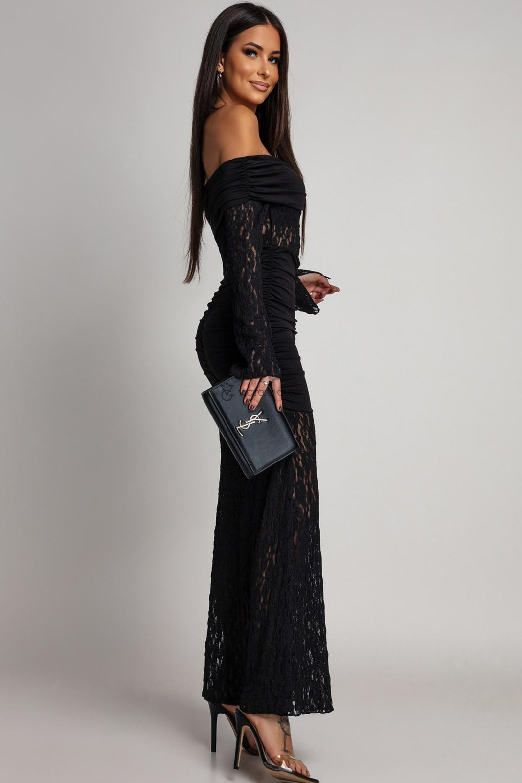 - Długa sukienka koronkowa z dekoltem hiszpanką