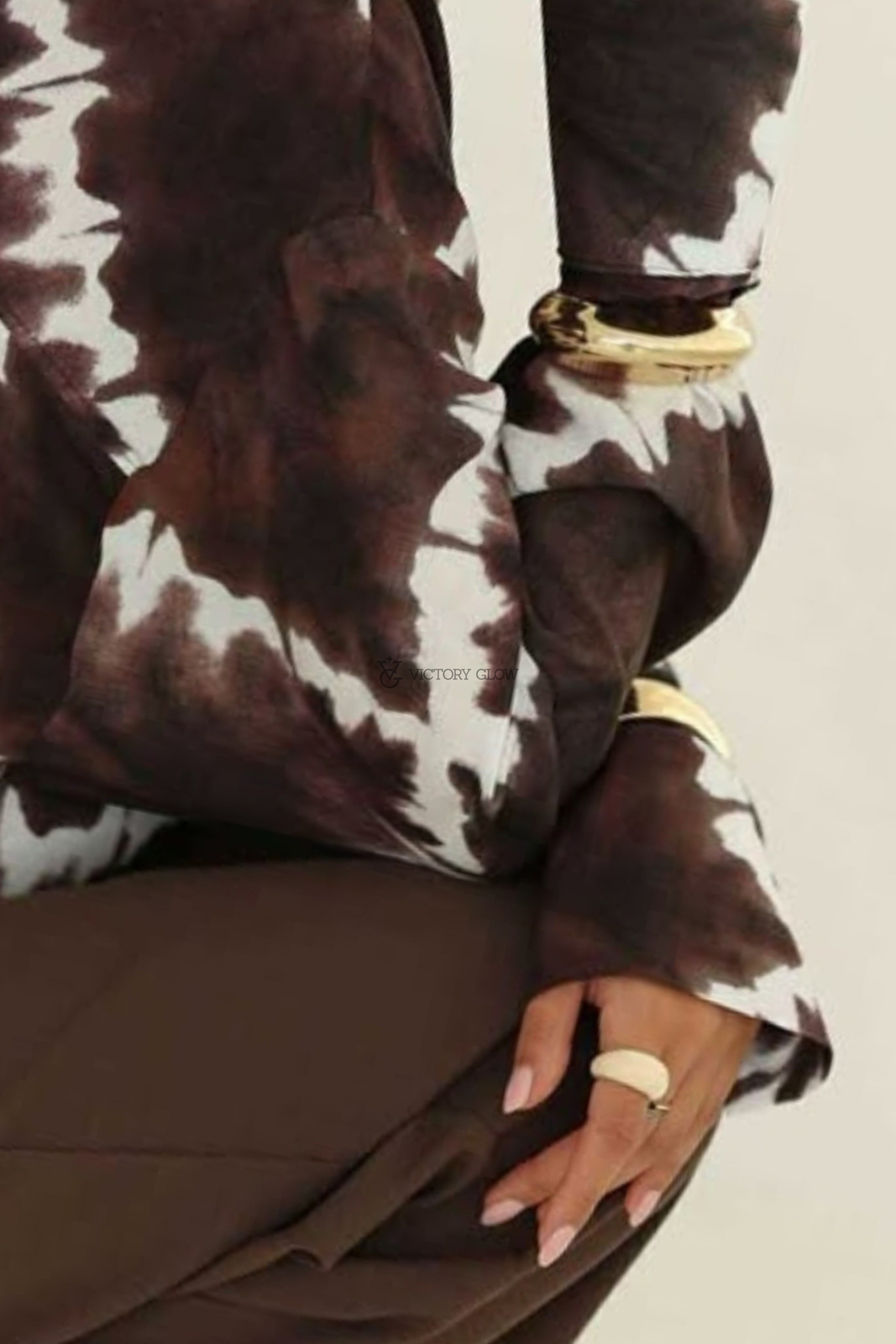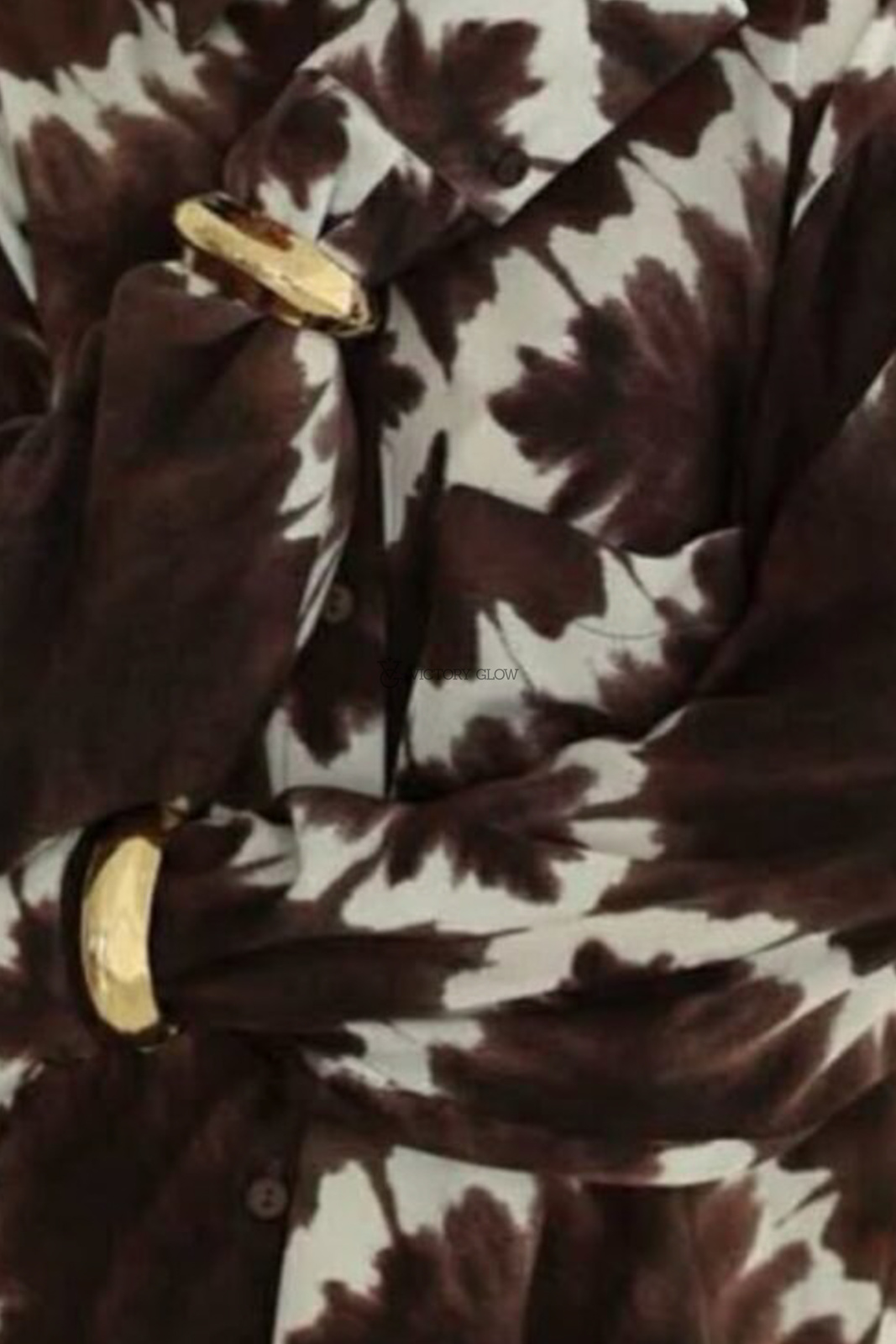 Klasyczny kołnierzyk i zapinanie na guziki nadają całości eleganckiego charakteru, podczas gdy długie, swobodnie układające się rękawy z mankietami podkreślają nowoczesny styl.