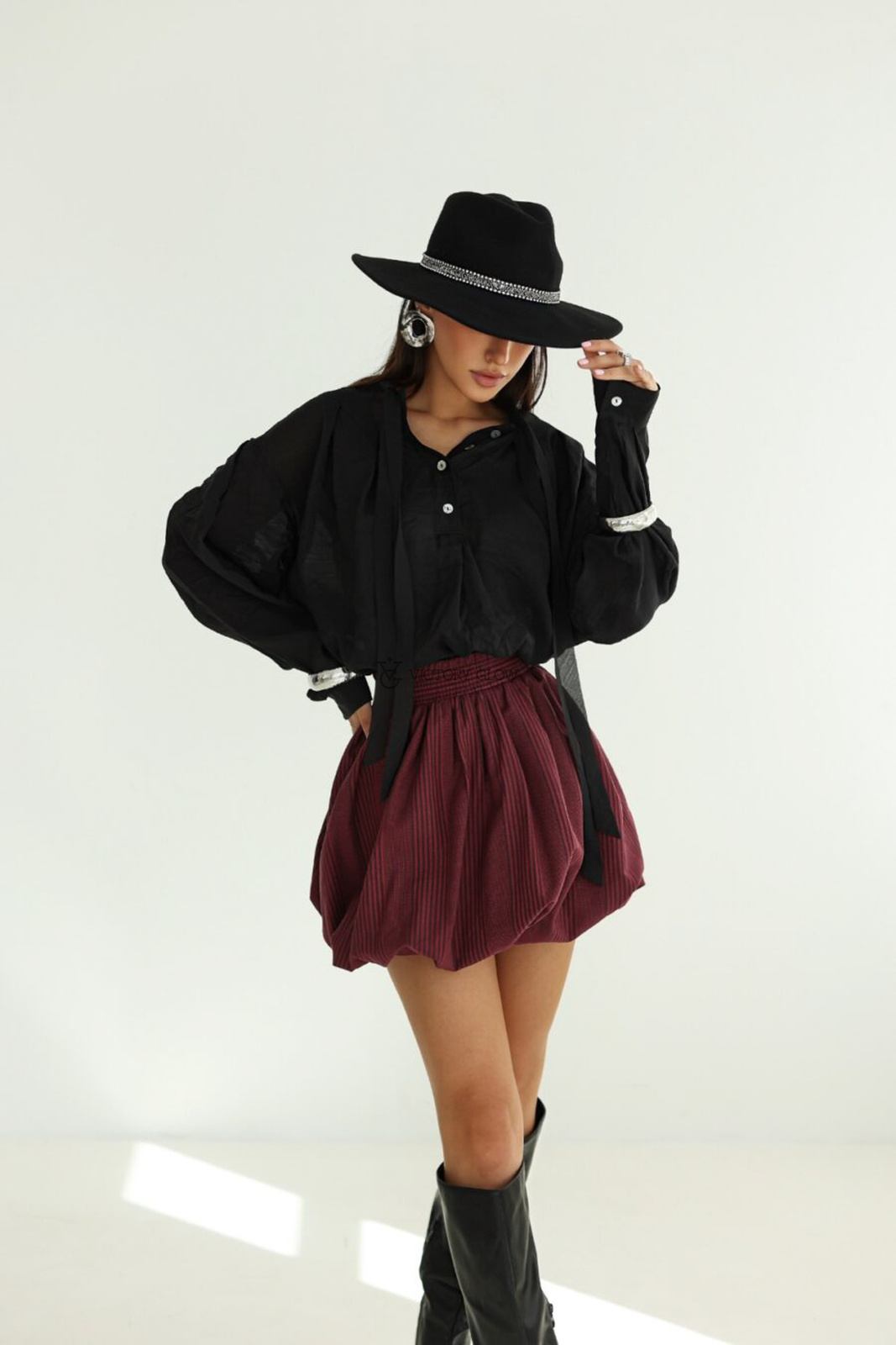 Długie, szerokie rękawy zakończone mankietami nadają stylizacji wyjątkowego charakteru.