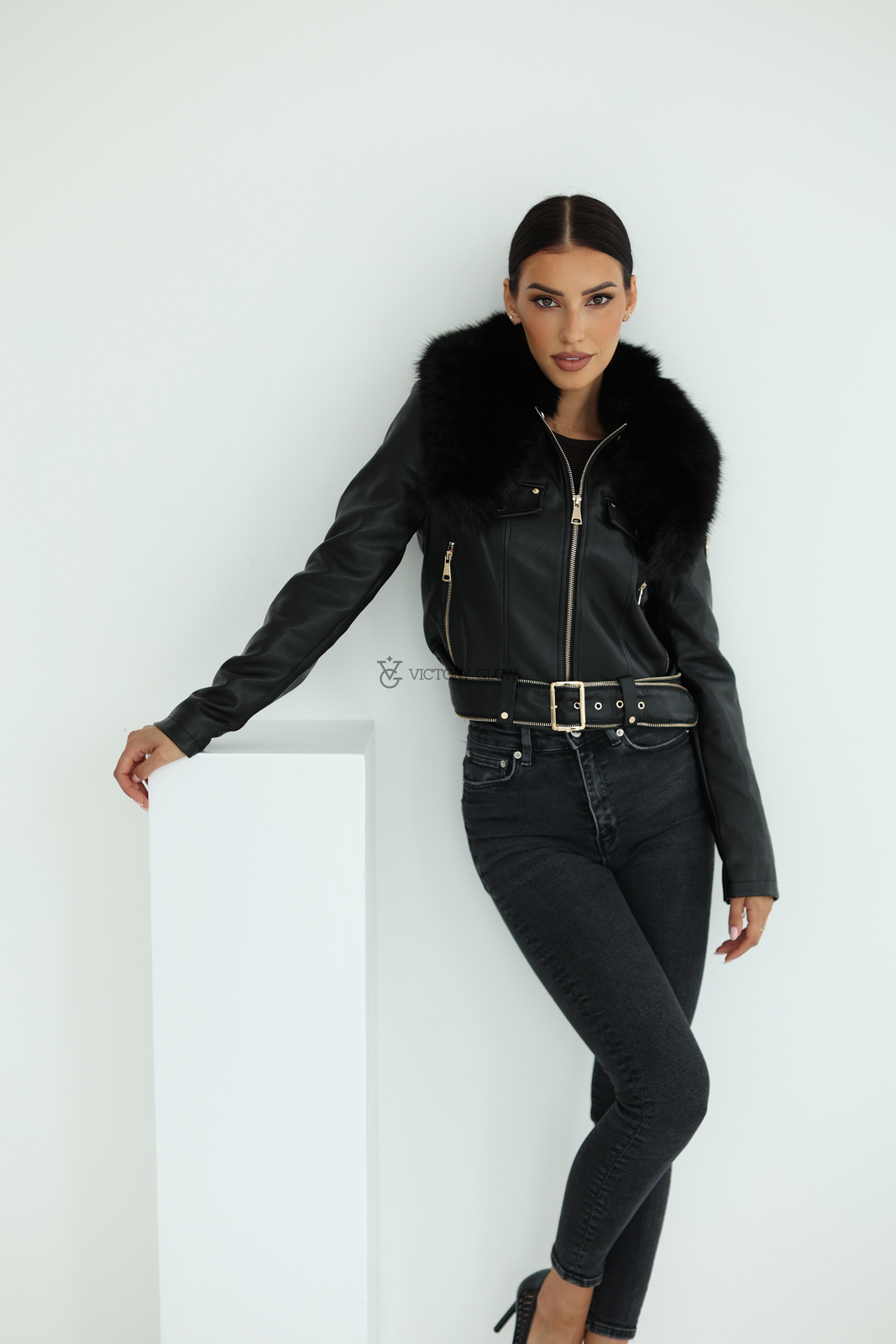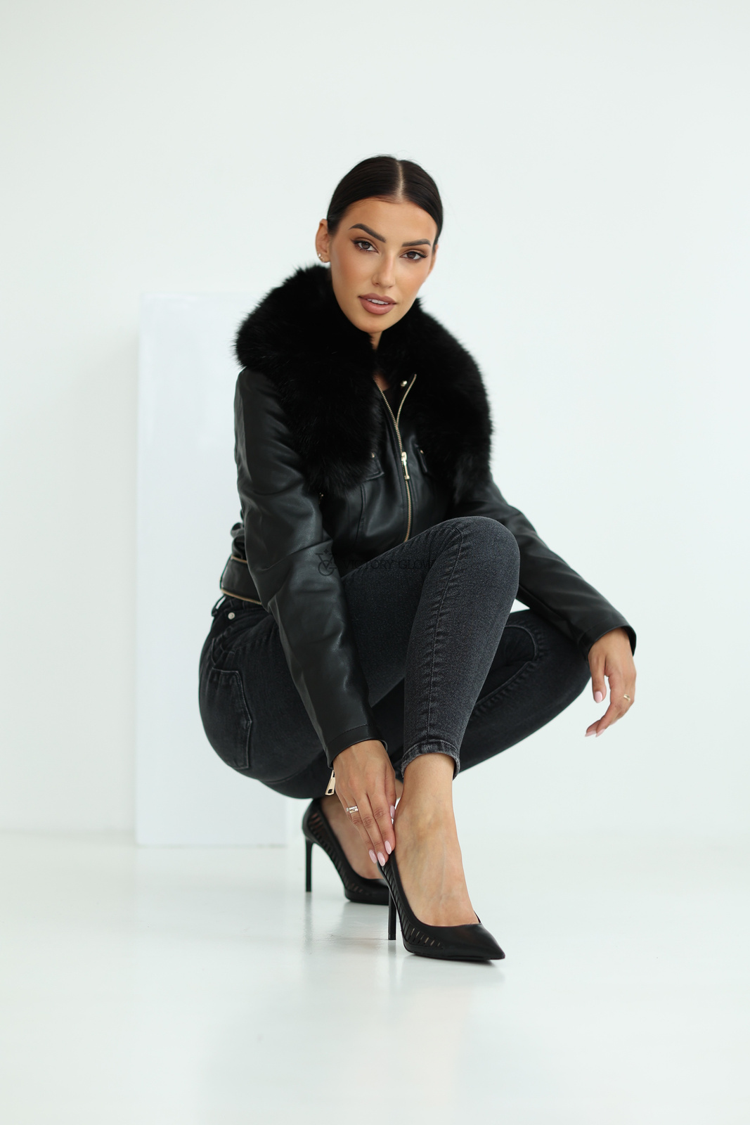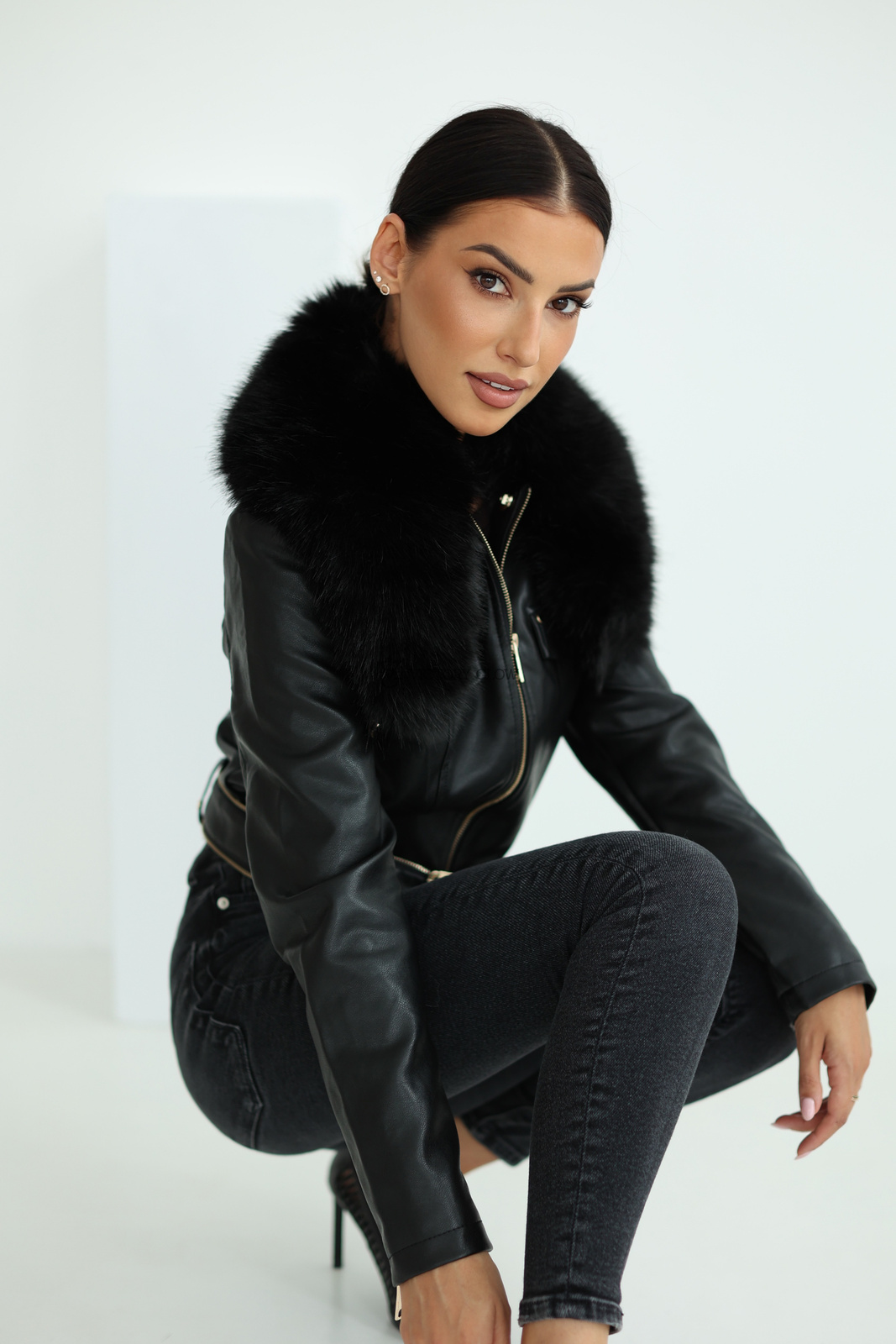 • Klasyczna krótka kurtka z futerkiem na kołnierzu , zapinana na zamek, eco skóra