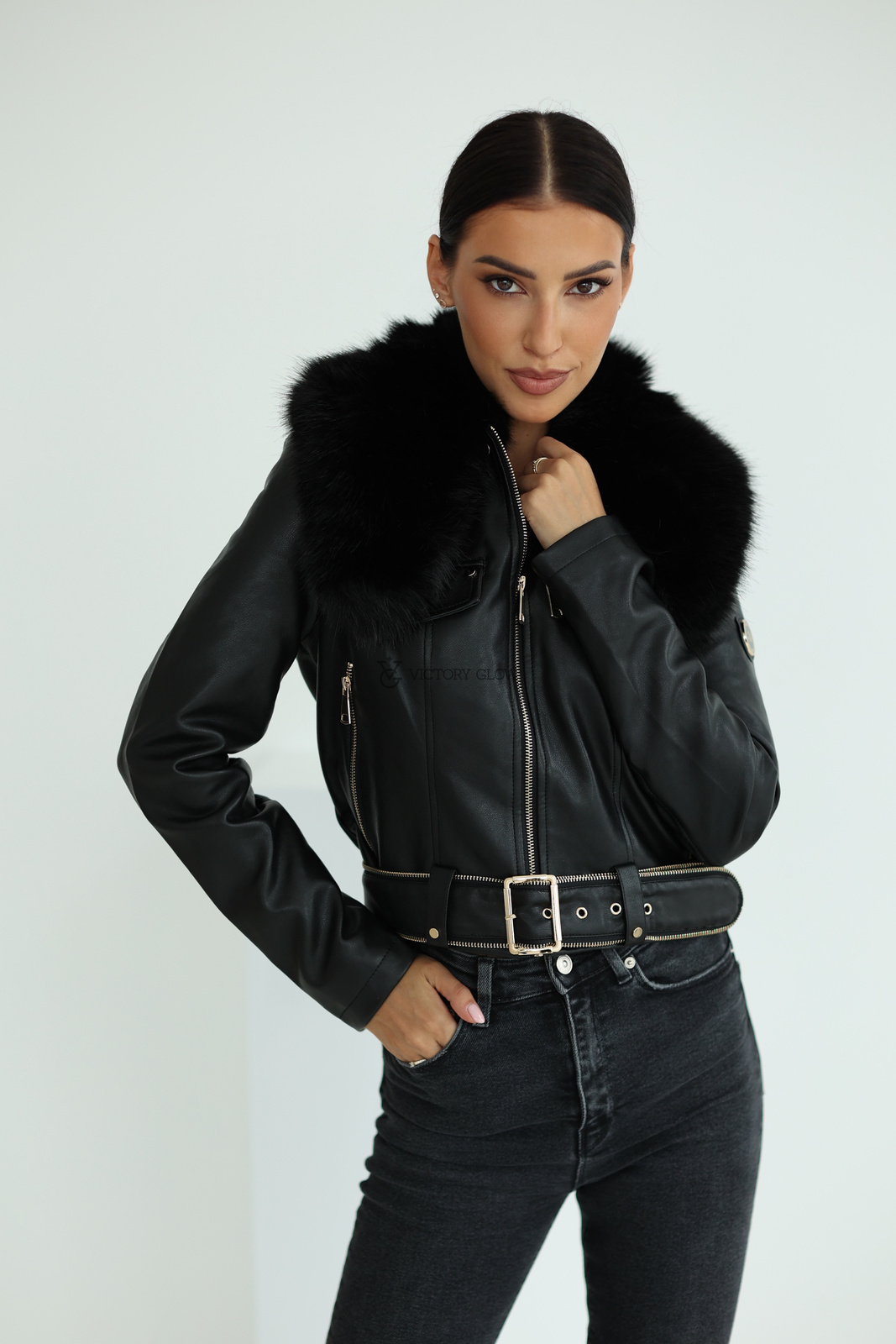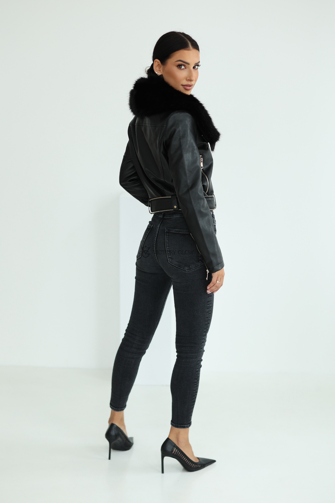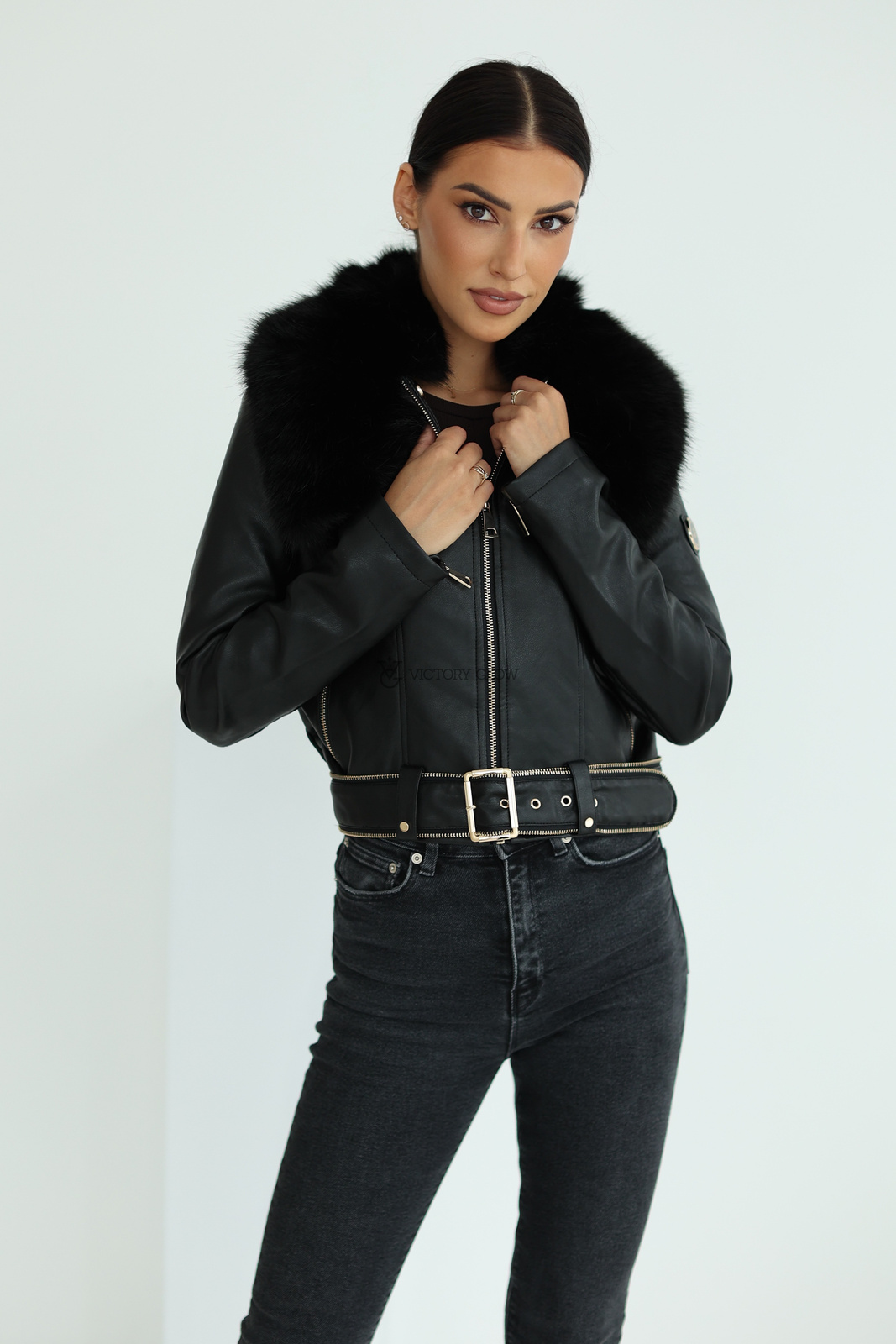 • Klasyczna krótka kurtka z futerkiem na kołnierzu , zapinana na zamek, eco skóra