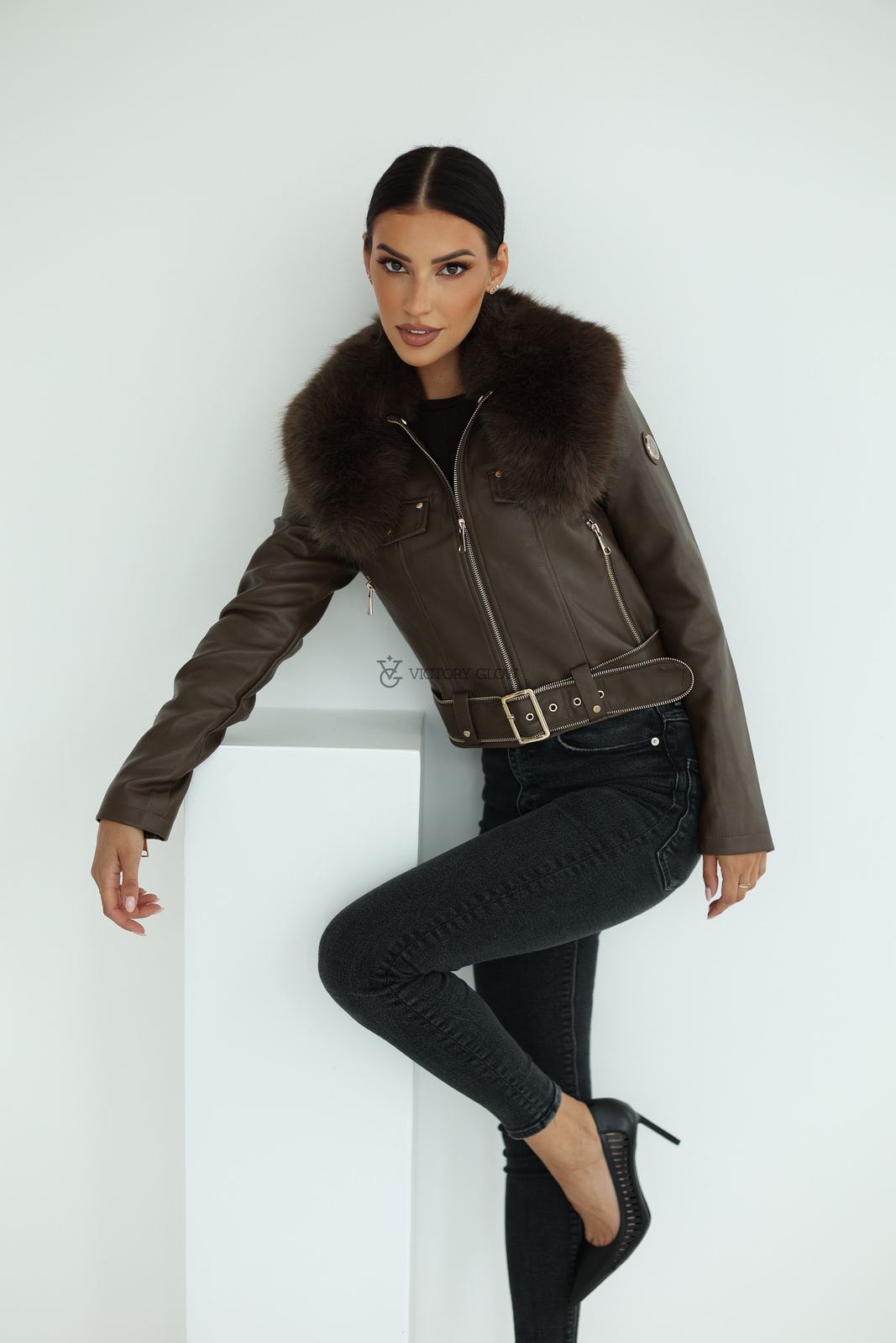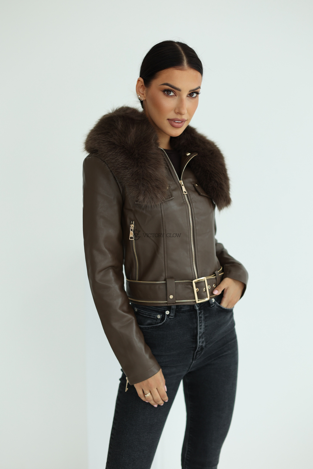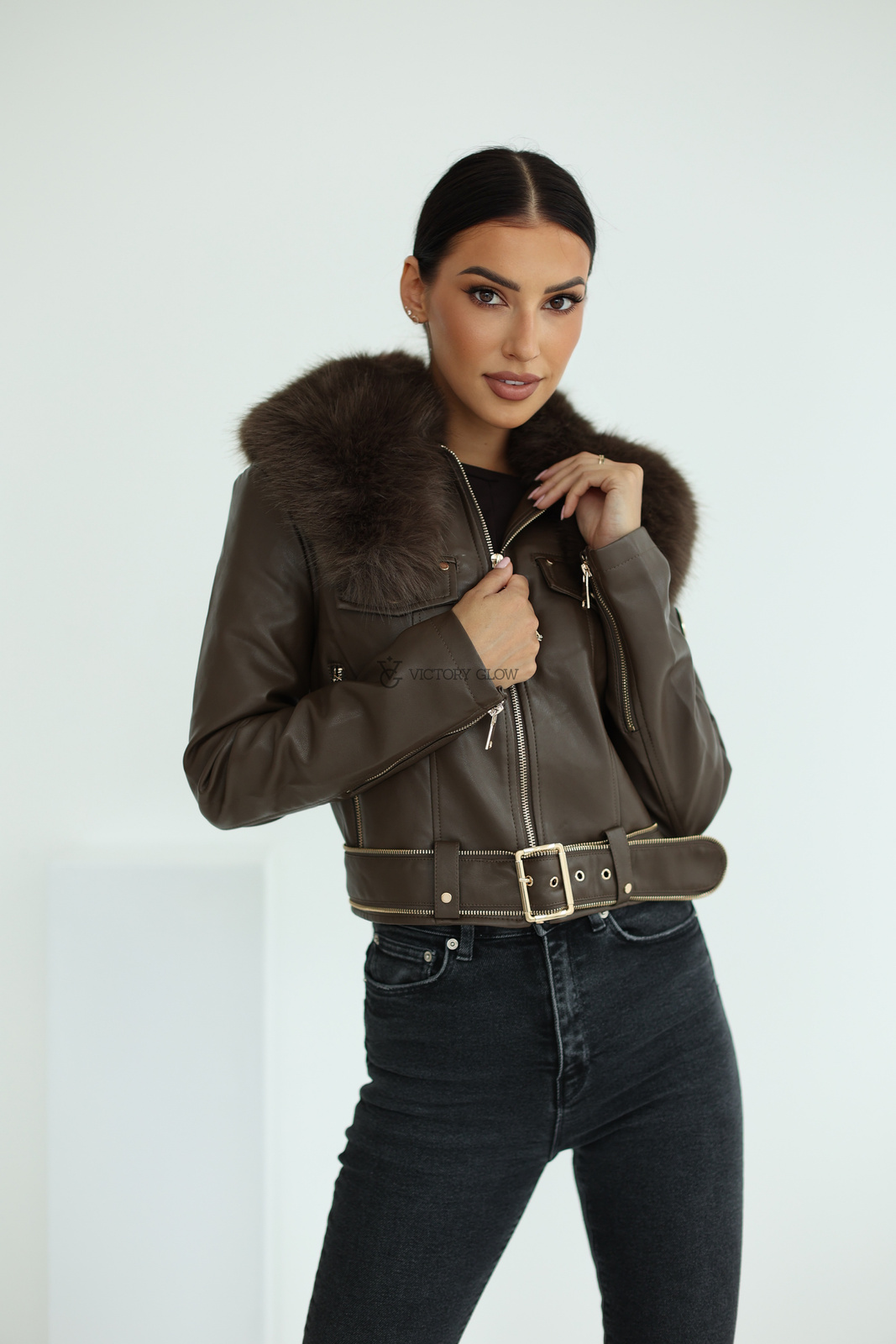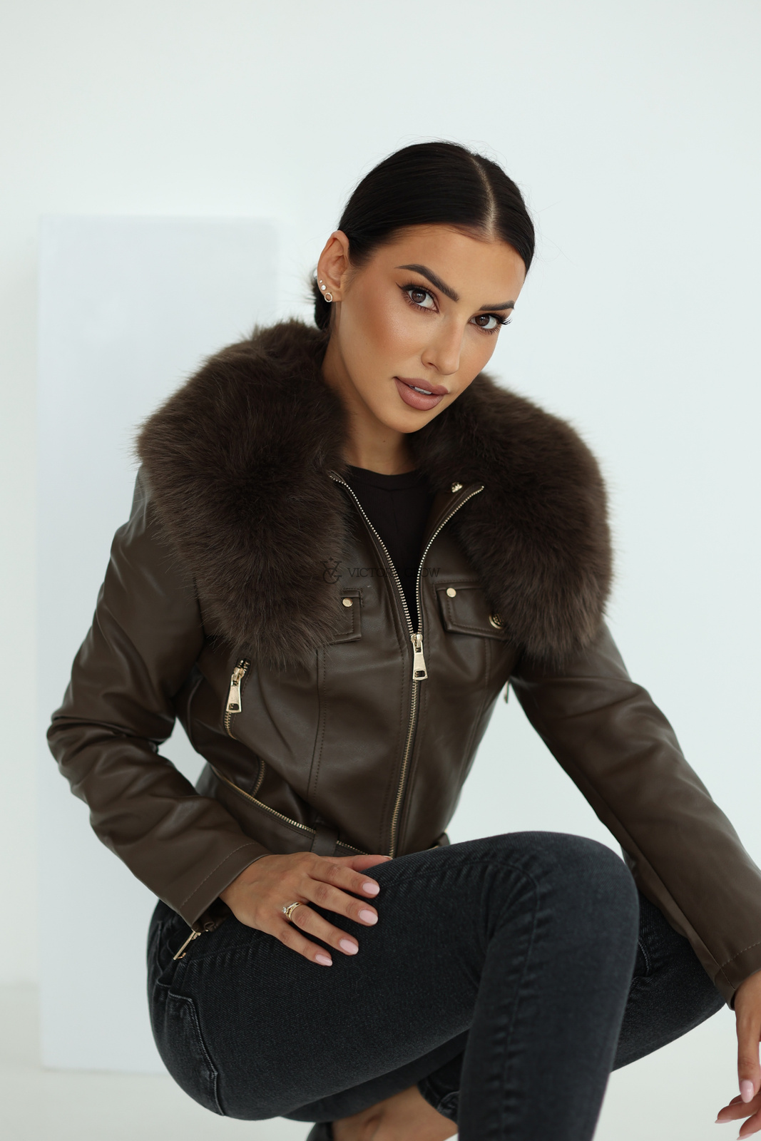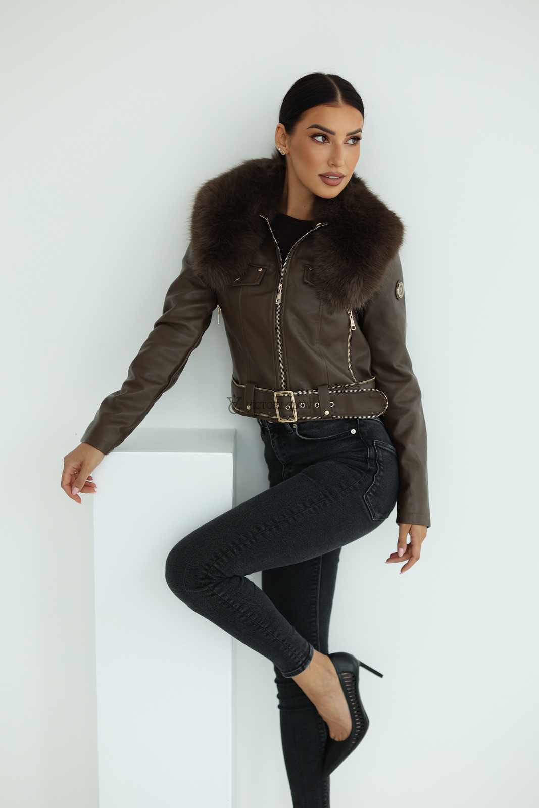 - Klasyczna krótka kurtka z futerkiem na kołnierzu , zapinana na zamek, eco skóra