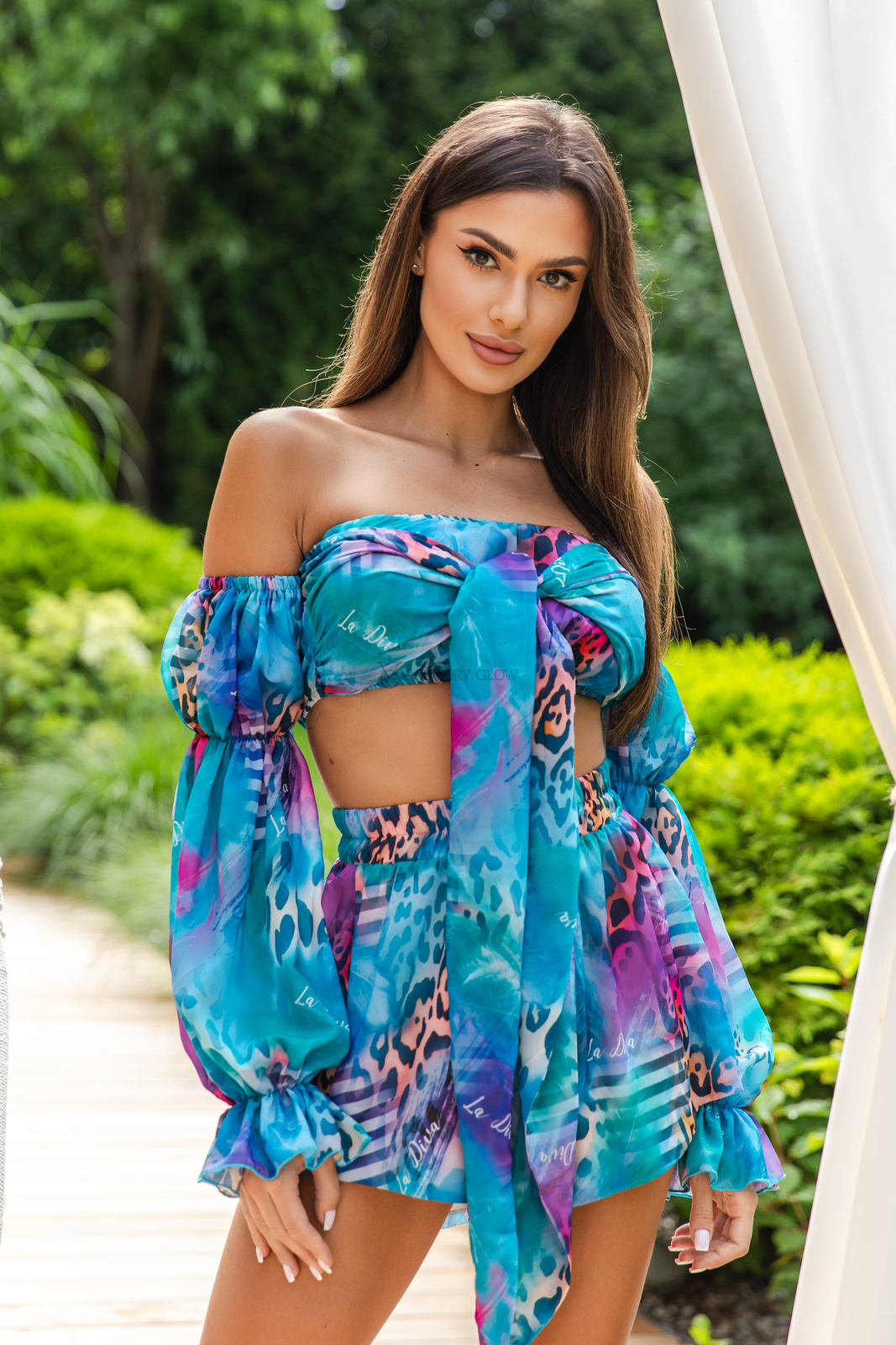 - Komplet La Diva z krótkimi spodenkami i krótką bluzką carmen , wzór w cętki