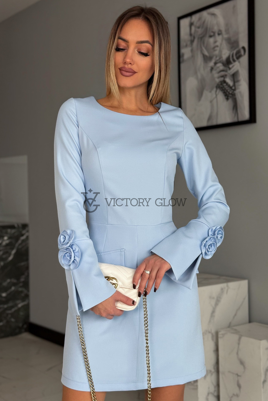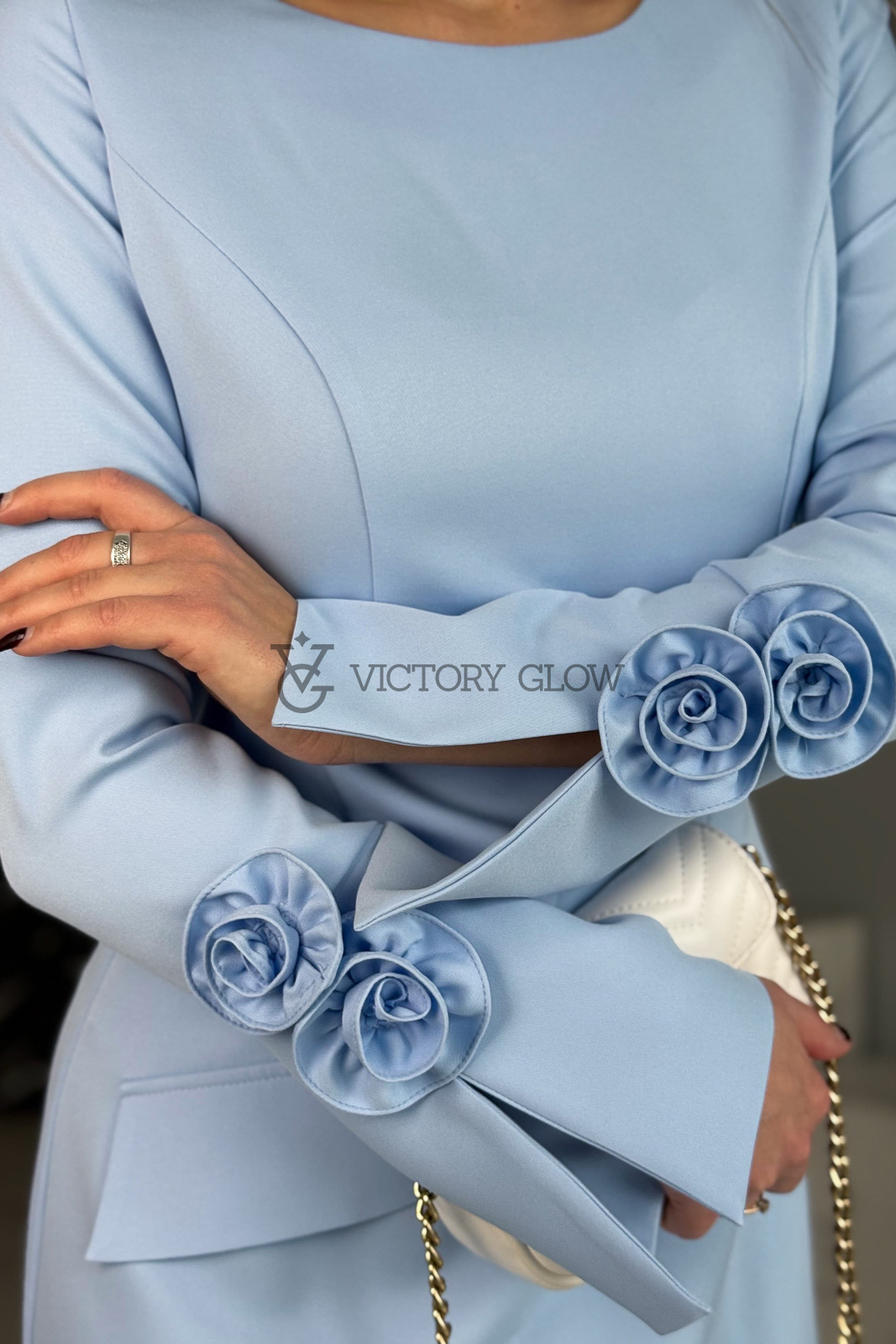 Ołówkowa sukienka z różą na rękawach Marly błękitna