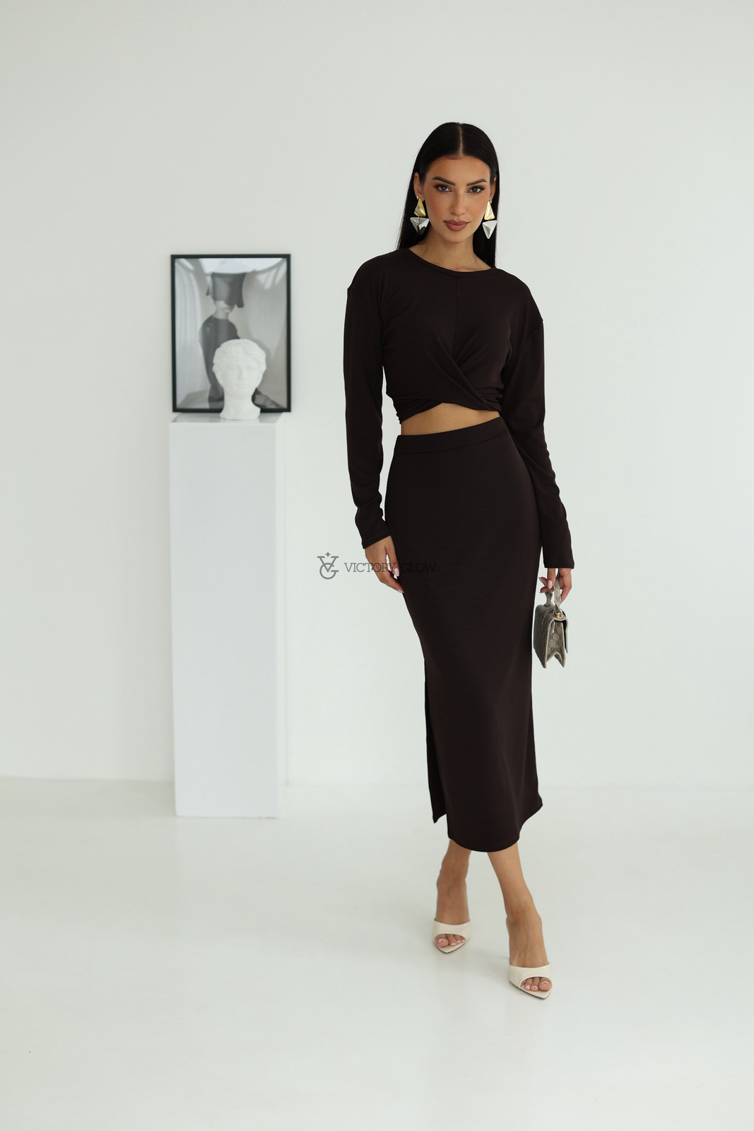 Prążkowany komplet Pamela bluzka i spódnica czekoladowy