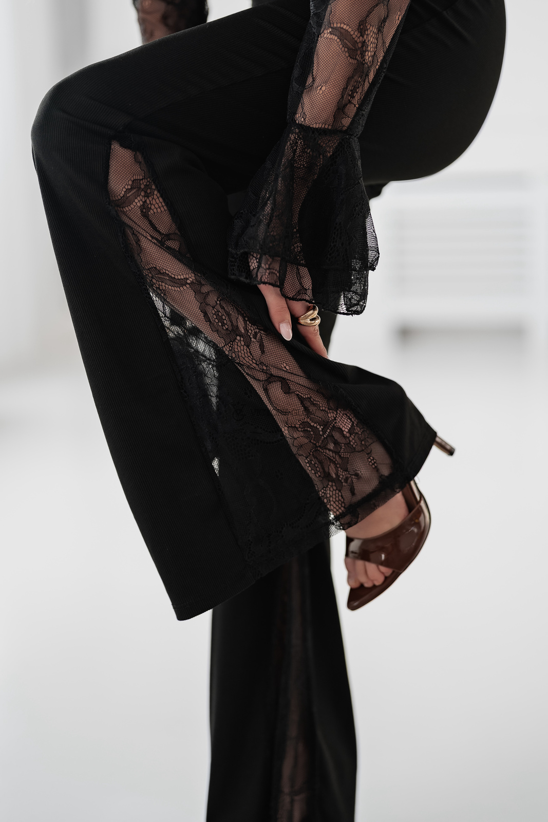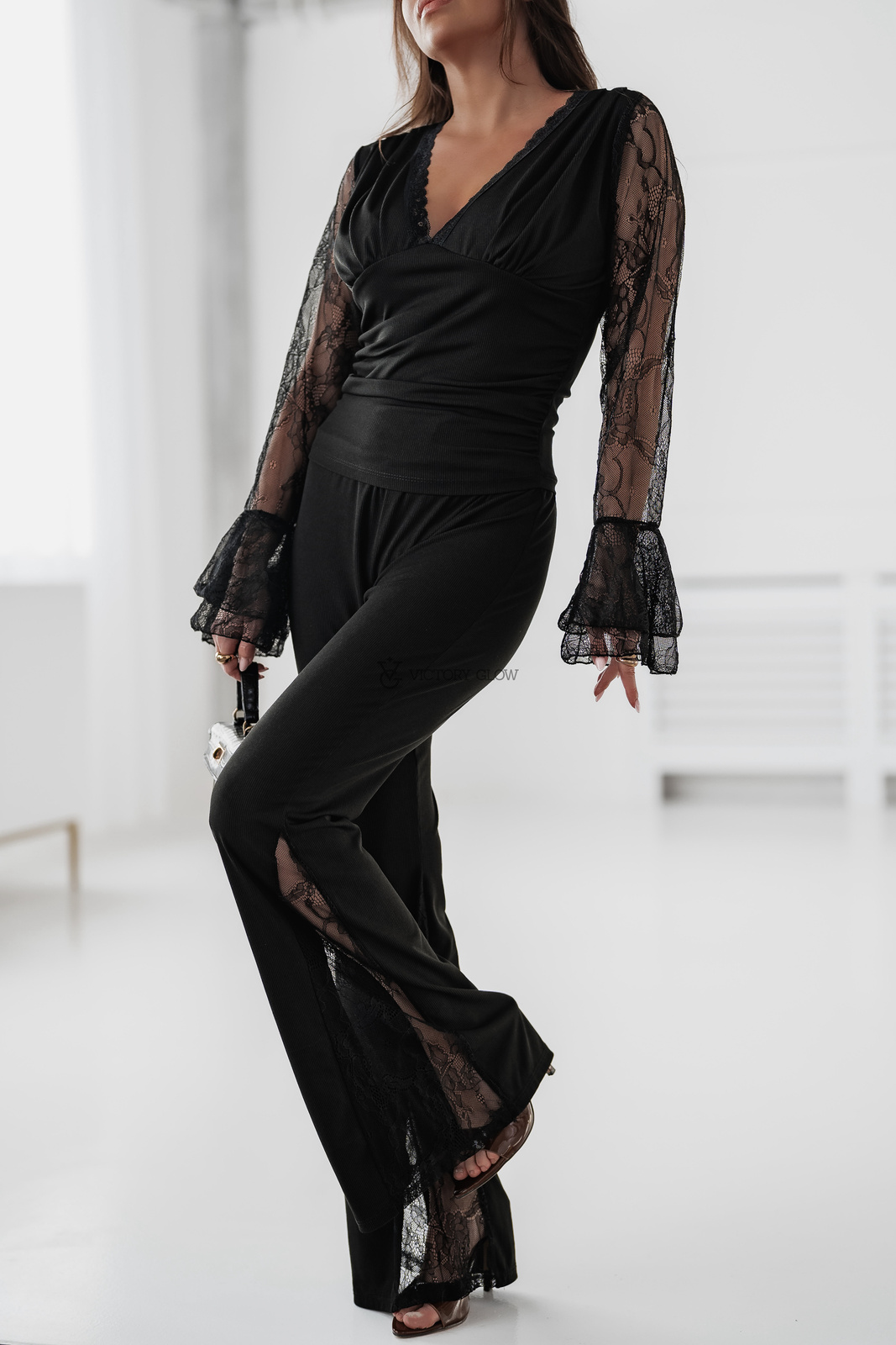 Po bokach umieszczono koronkowe wstawki z transparentnej koronki, harmonijnie nawiązujące do góry zestawu i dodające całości kobiecego uroku. To komplet idealny na wyjątkowe okazje, wieczorne wyjścia, ale także wtedy, gdy chcesz wyglądać stylowo i kobieco na co dzień.