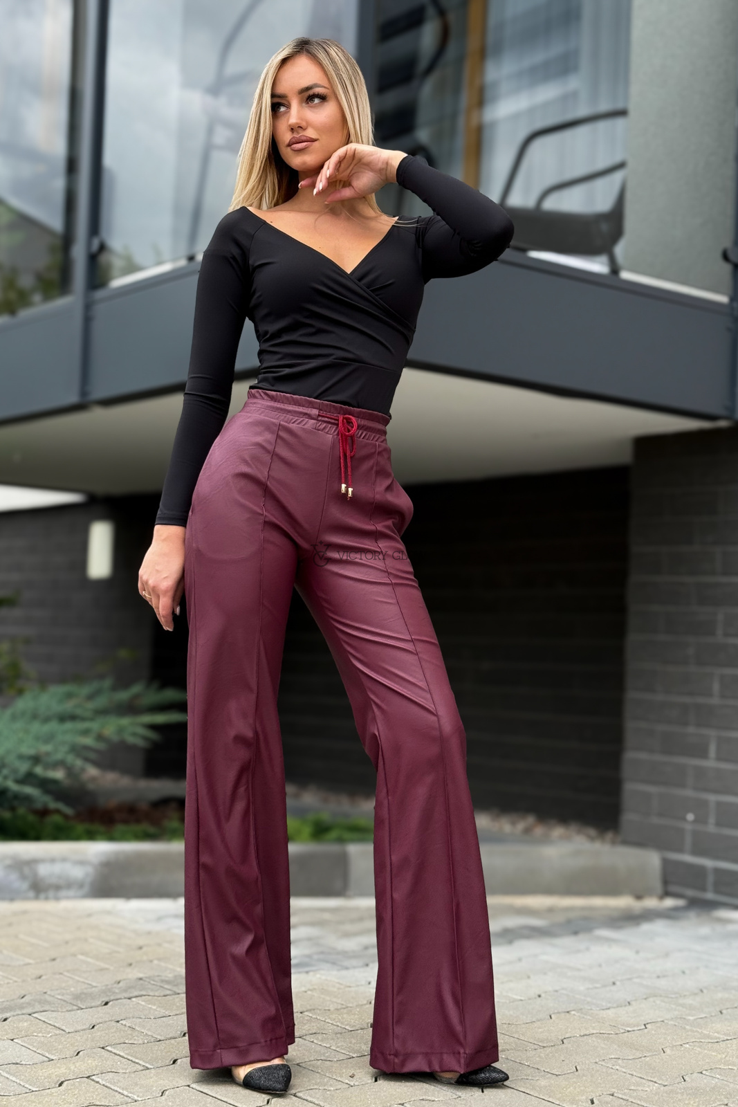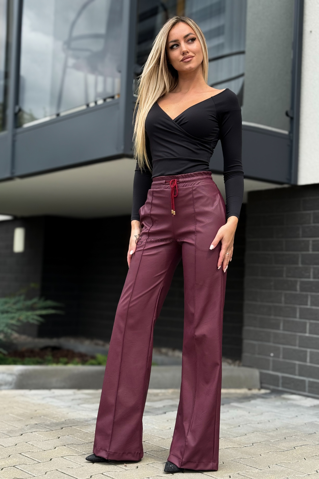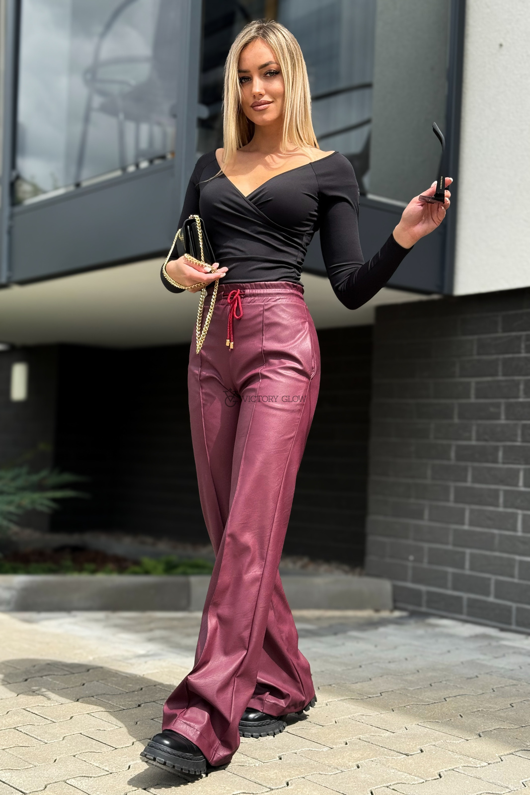 Spodnie z wysokim stanem eko skóra Surya bordowe