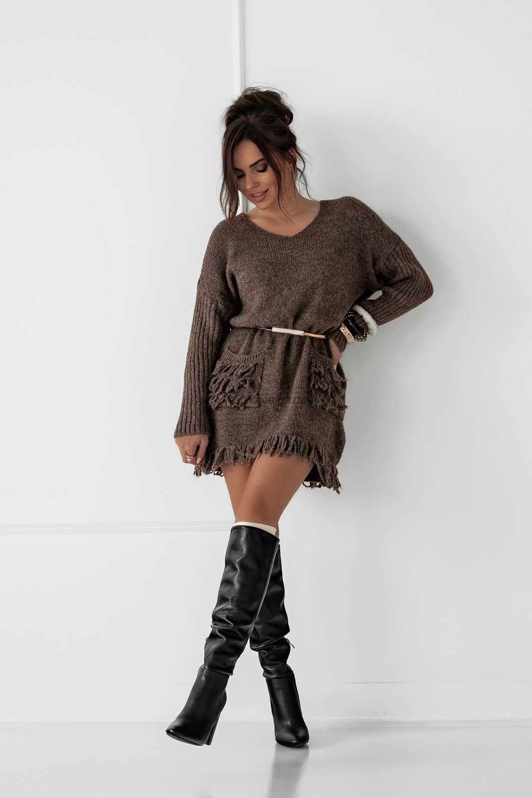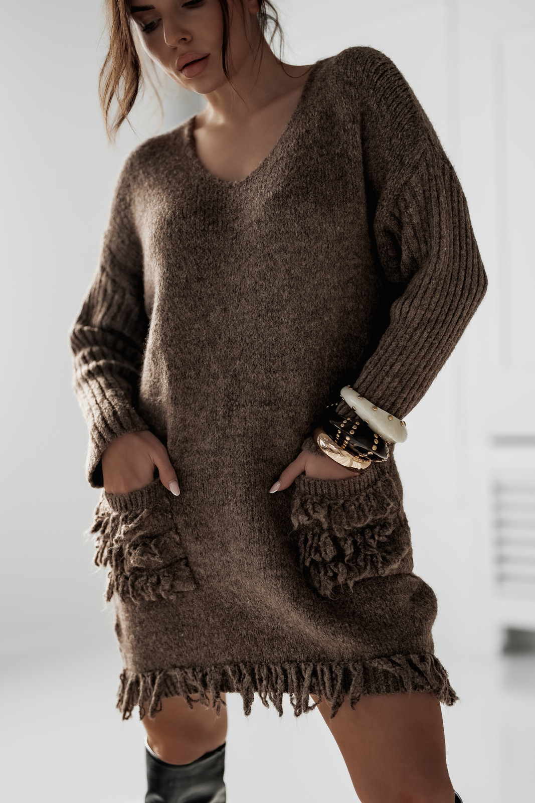 Sukienka dzianinowa z frędzlami Tedi brunatna