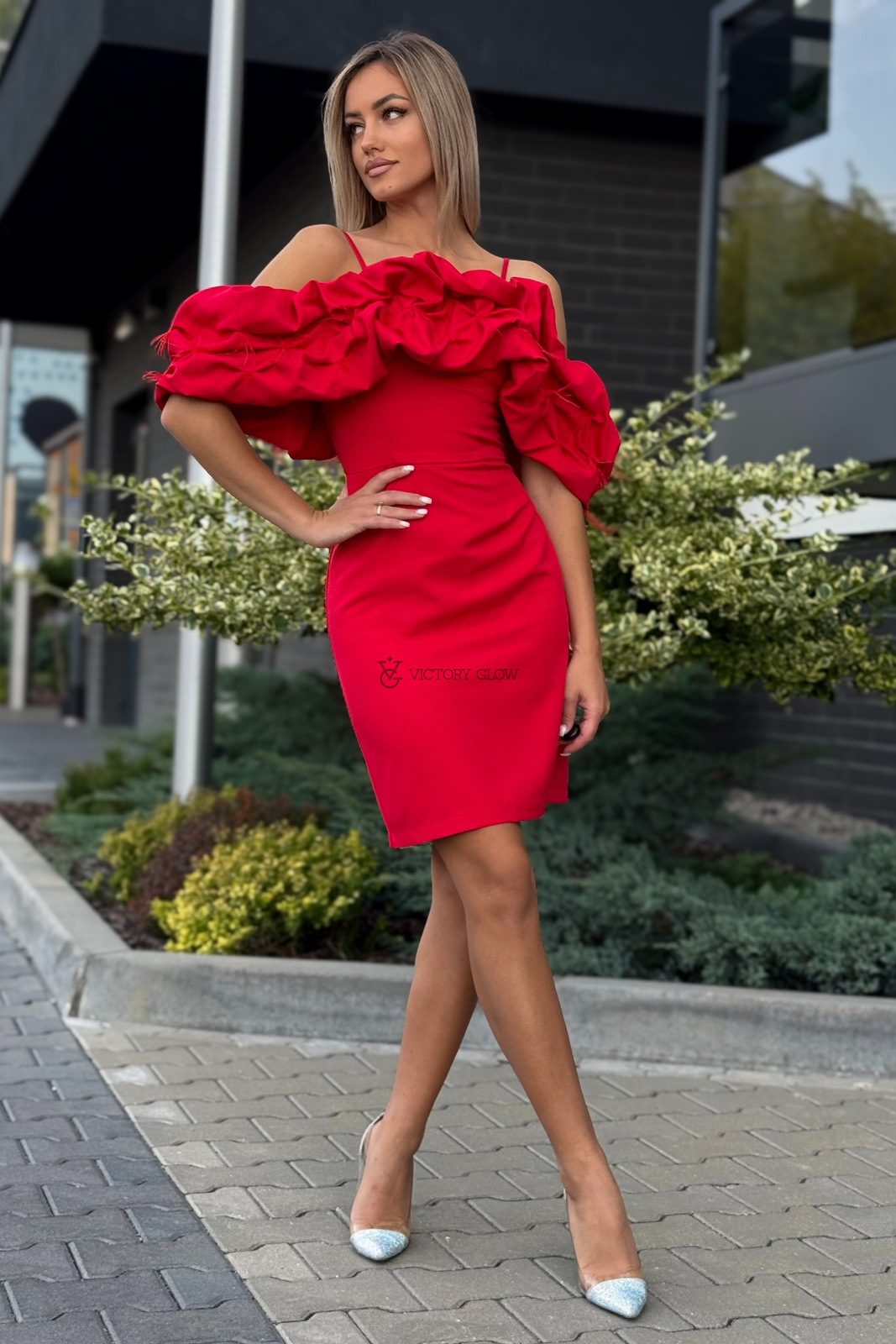• Sukienka koktajlowa midi hiszpanka z bufiastym rękawem