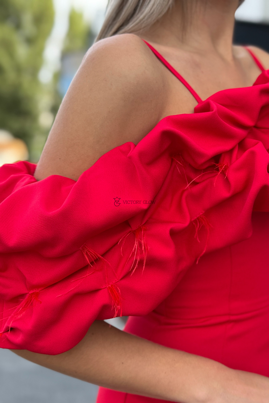 Delikatne zdobienia z naturalnych piór przy dekolcie i rękawach sprawiają, że sukienka prezentuje się niezwykle luksusowo i przyciąga spojrzenia. Model zapinany z tyłu na dyskretny suwak, co zapewnia komfort noszenia i doskonałe dopasowanie.