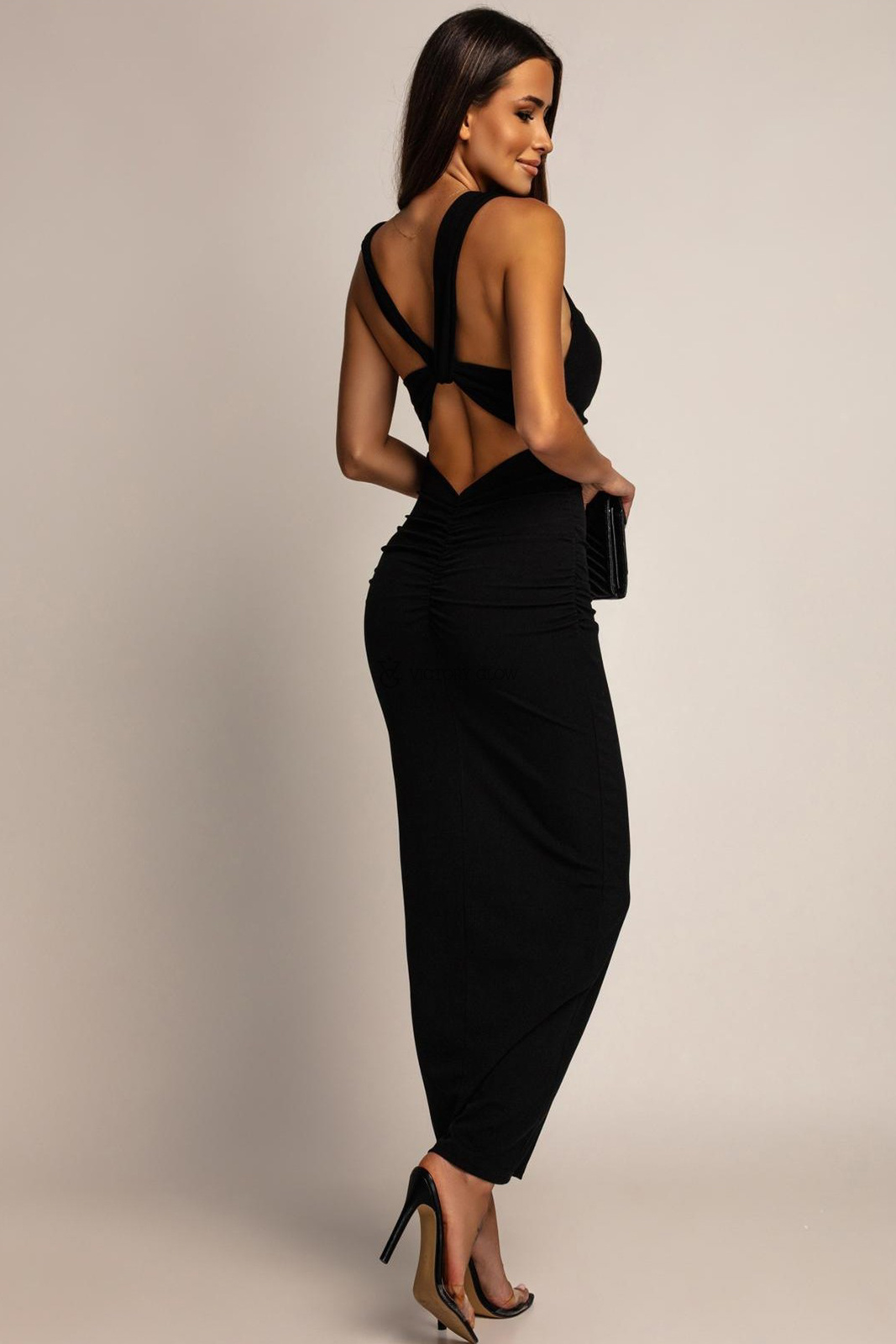 Klasyczny przód z lejącym dekoltem kontrastuje z odkrytymi plecami, które zdobi efektowne przeplatanie ramiączek, tworząc niebanalny, przyciągający wzrok akcent.
