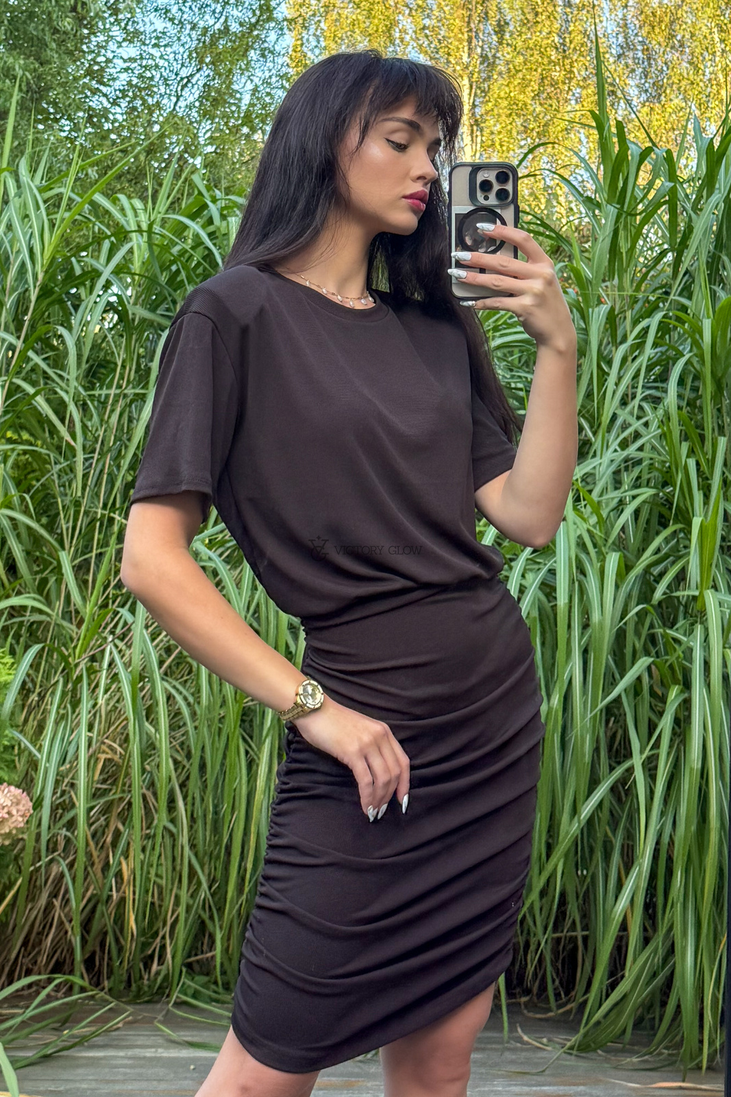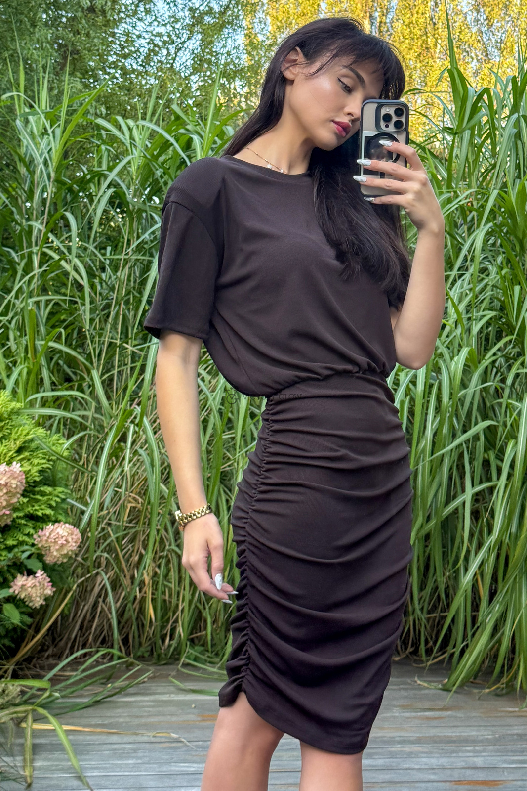 Model z luźniejszą górą i dopasowanym, marszczonym dołem tworzy efekt tzw. "nietoperza", który świetnie układa się na ciele i tuszuje ewentualne niedoskonałości.