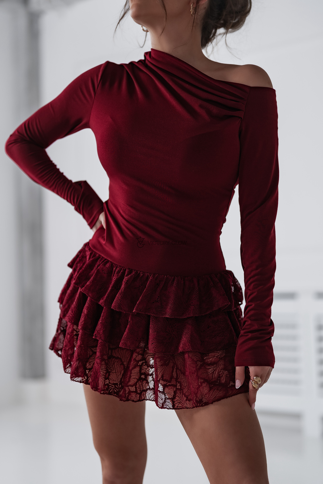 Dolna część sukienki została wykończona koronkowymi falbanami, tworząc romantyczny, wyrafinowany akcent i dodając stylizacji wyjątkowego uroku.