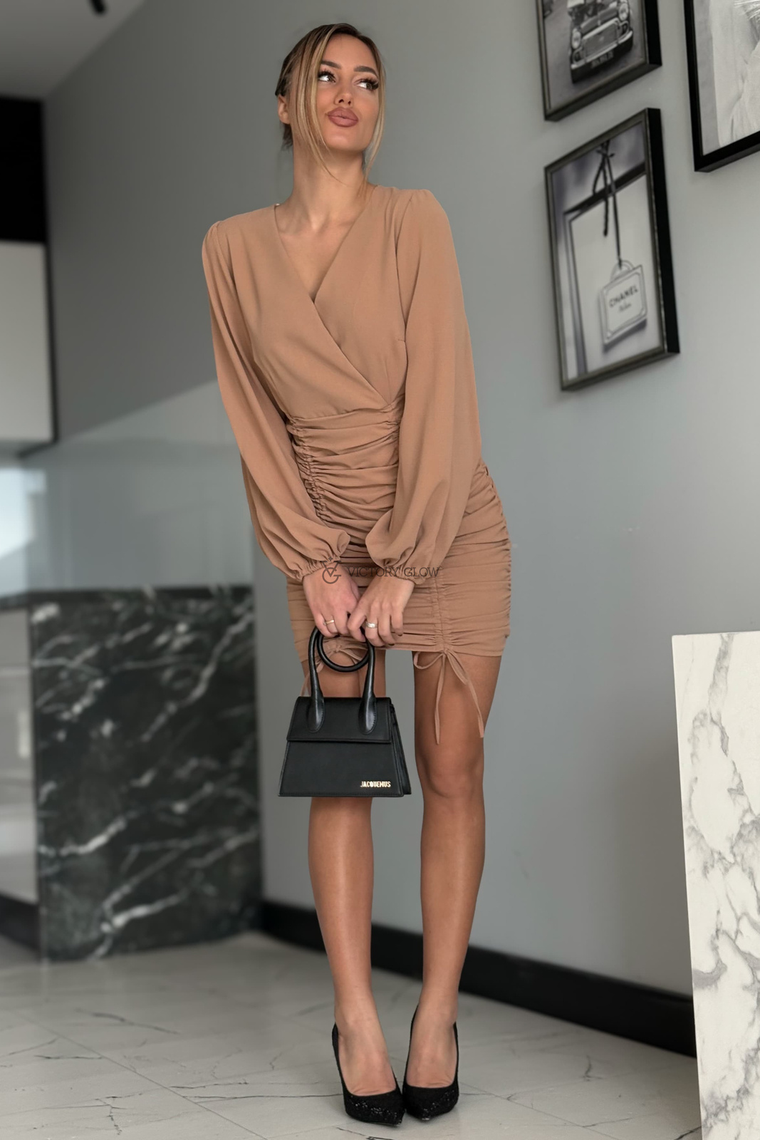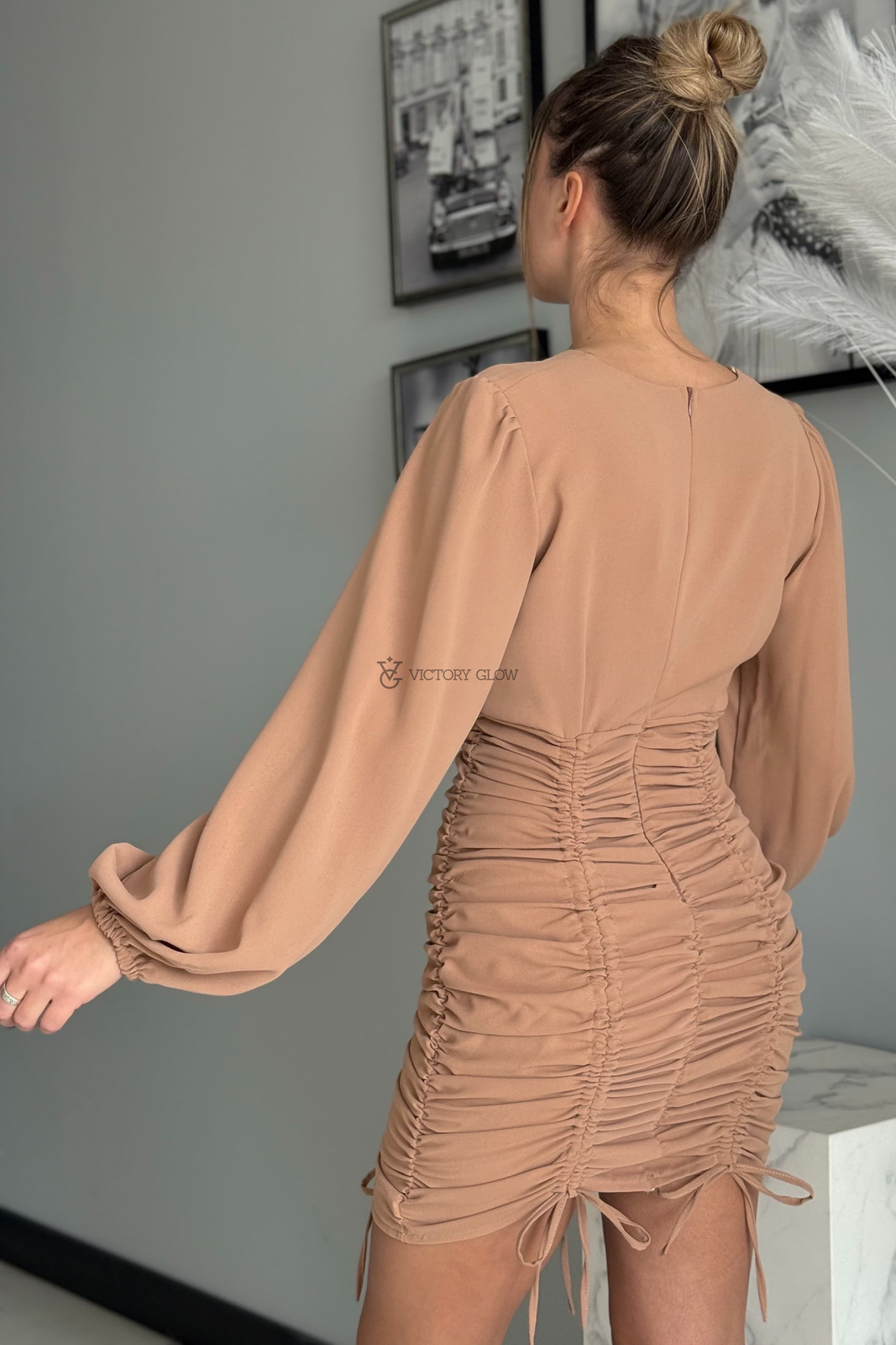 Model posiada zakładany dekolt, który subtelnie podkreśla biust, oraz bufiaste rękawy zakończone delikatną gumką, dodające całości lekkości i romantycznego charakteru. Na plecach umieszczono kryty zamek, zapewniający wygodne zakładanie i idealne dopasowanie do sylwetki.