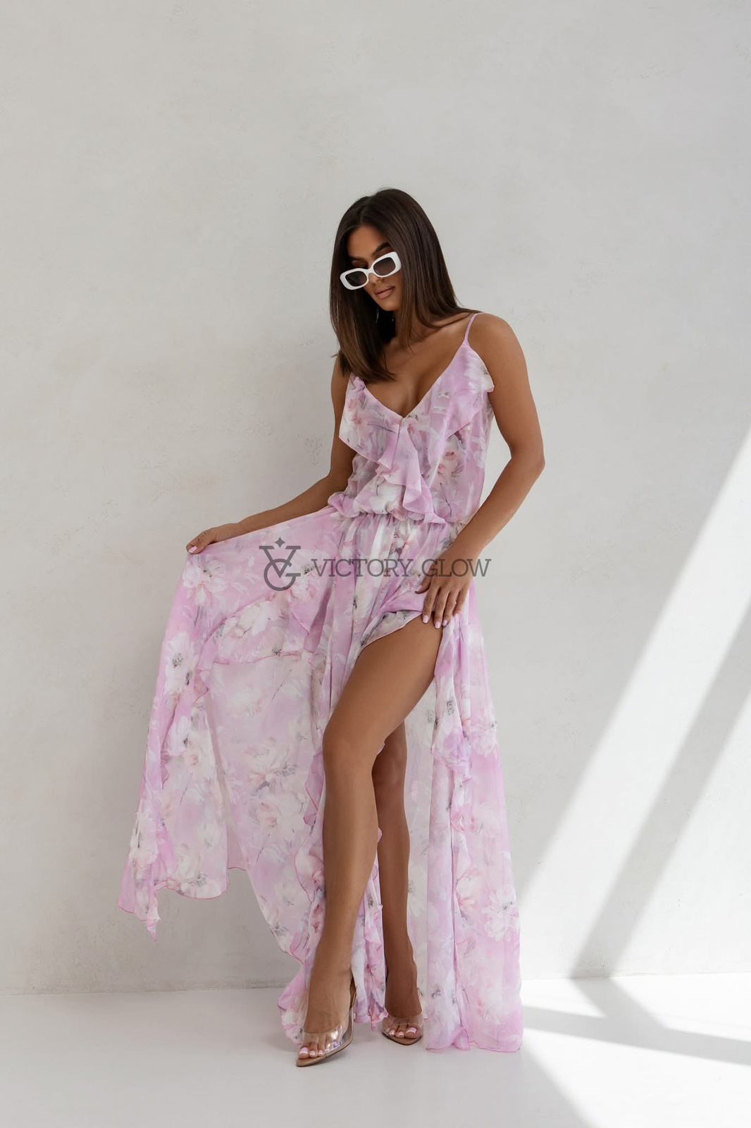 Zwiewny materiał pięknie układa się w ruchu, a głęboki dekolt z falbanami dodaje romantycznego uroku. Model został zaprojektowany z myślą o wyjątkowych okazjach.