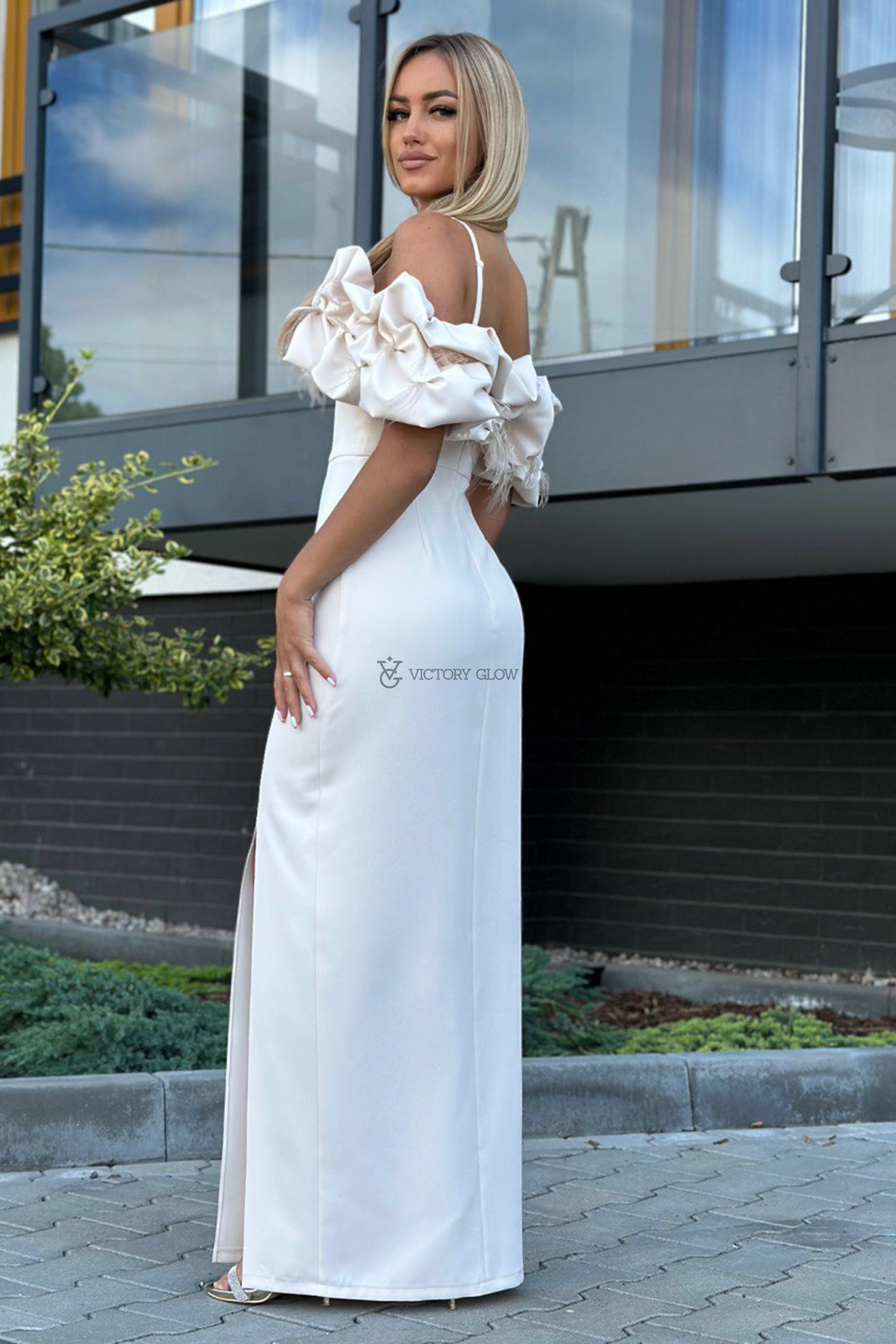Delikatne zdobienia z naturalnych piór przy dekolcie i rękawach sprawiają, że sukienka prezentuje się niezwykle luksusowo i przyciąga spojrzenia. Model zapinany z tyłu na dyskretny suwak, co zapewnia komfort noszenia i doskonałe dopasowanie.